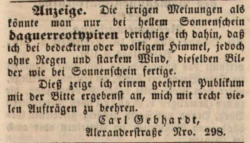 | Beschreibung | Zeitungsanzeige des Daguerreotypisten Carl Gebhardt, August 1847 | ||