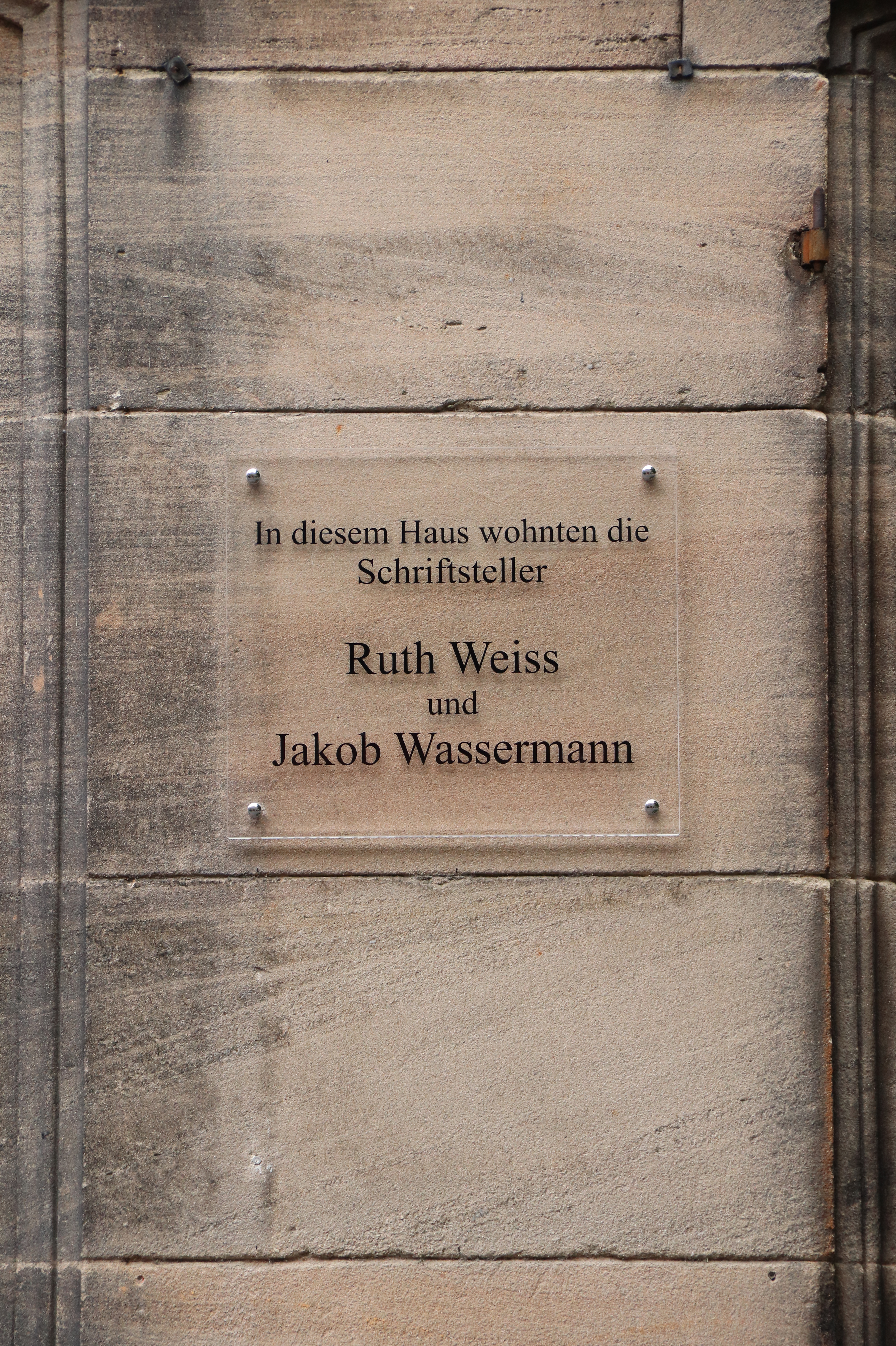 | Beschreibung | Gedenktafel für Ruth Weiss und Jakob Wassermann am Hauseingang der Theaterstraße 17, montiert von Hausbewohner Alexander Mayer am 28. Mai 2021 | ||