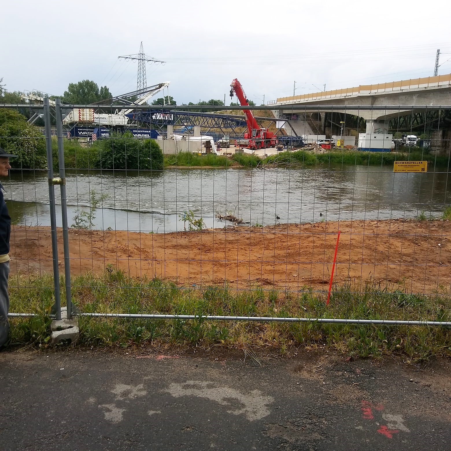 Kranaufbau und Vorarbeiten zum baldigen Einheben der neuen Gehwegbrücke über die Regnitz in Stadeln im Juni 2020