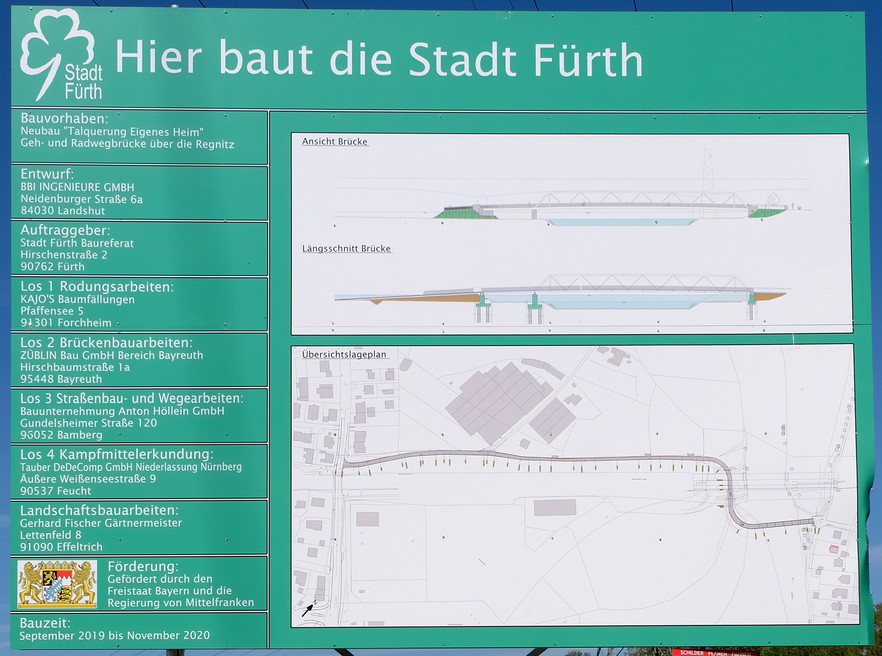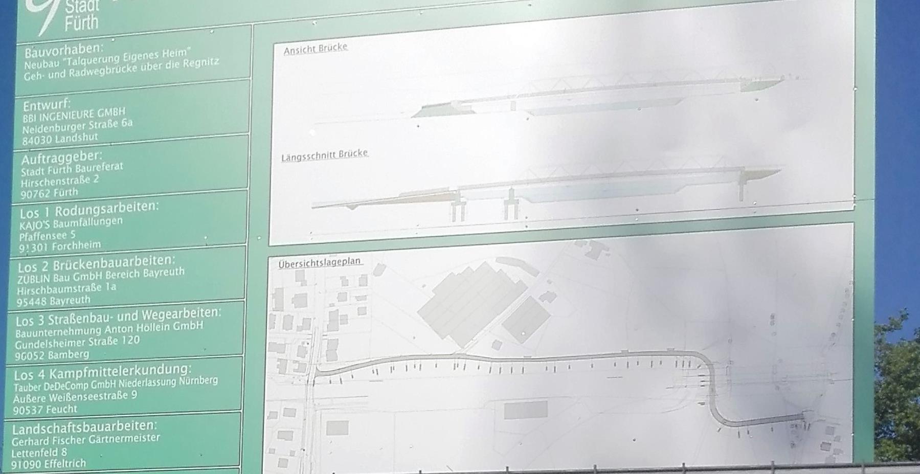 | Beschreibung | Bauschild der neuen Geh- und Radwegbrücke Regnitz neben der Regnitztalbrücke, Details, April 2020 | ||