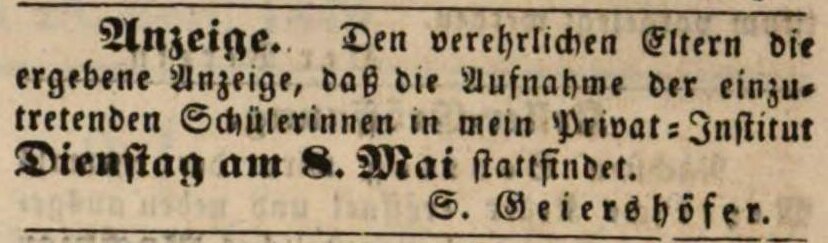 | Beschreibung | Zeitungsanzeige des Privat-Lehrers Simon Geiershöfer, April 1849 | ||