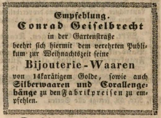 | Beschreibung | Zeitungsannonce des Juweliers Conrad Geiselbrecht, Dezember 1845 | ||