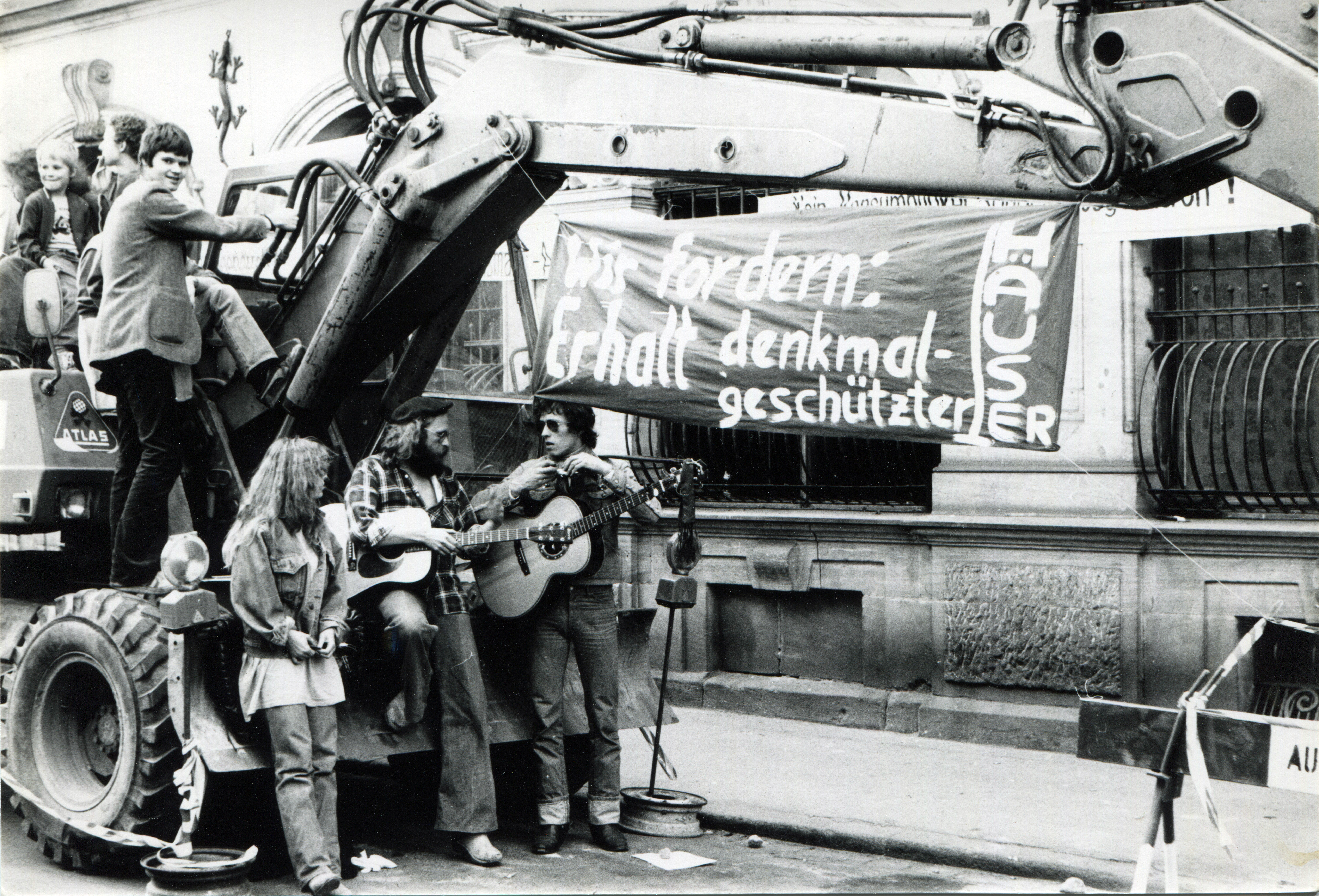 | Beschreibung | Hausbesetzung der ehem. Geismann-Bräustübl als Protestform gegen den Abriss, 1982 | ||