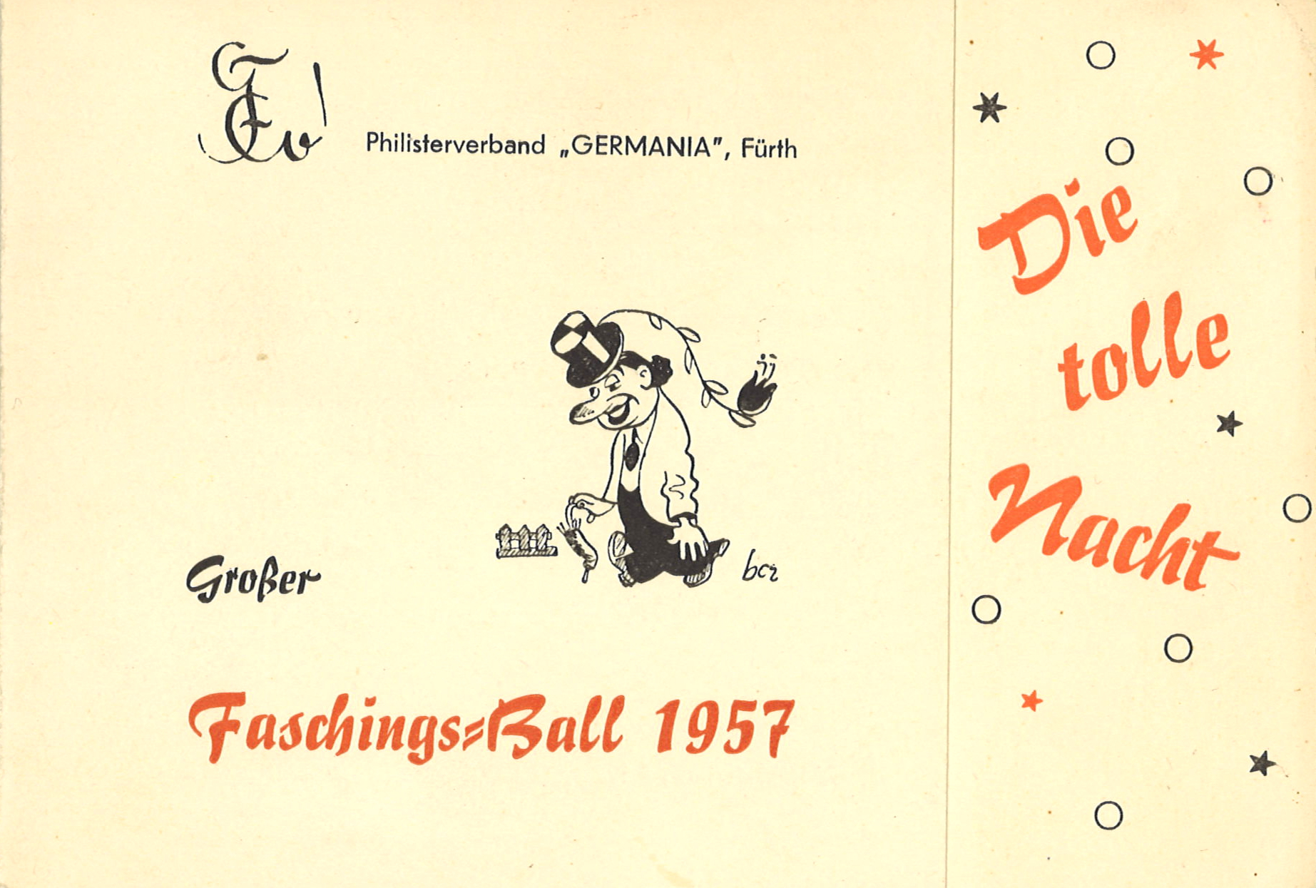 | Beschreibung | Einladungskarte der Germania zum Faschingsball 1957 in der Gaststätte Zum Bergbräu | ||