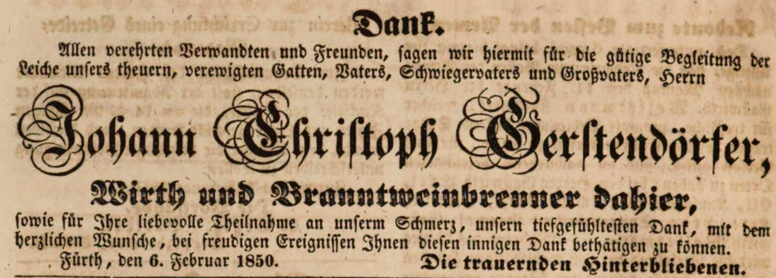 | Beschreibung | Todesanzeige für den Branntweinbrenner Johann Christoph Gerstendörfer, Februar 1850 | ||