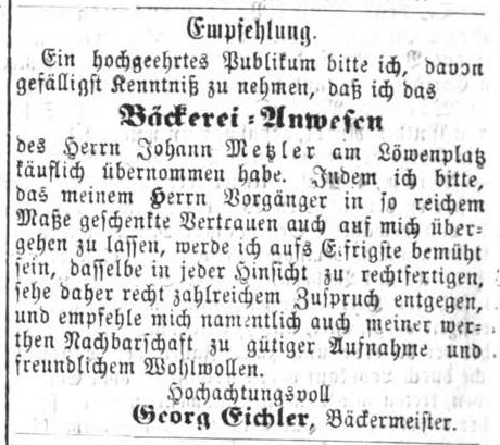 | Dateiinfo (Bild-Unterschrift und Info-Box, automatisch erstellt) | Geschäftsübernahme des Bäckerei-Anwesens Metzler durch Bäckermeister Georg Eichler (FT 7. Mai 1868) Lizenz: NoC-NC 1.0 | ||