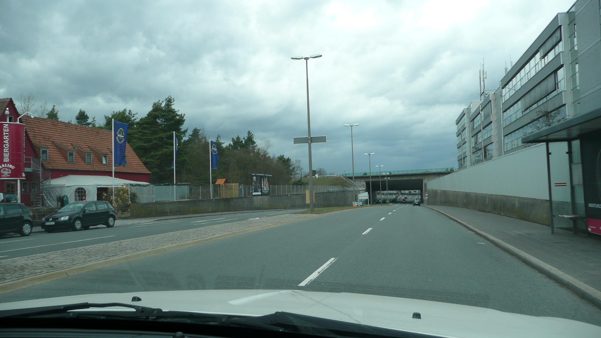 | Beschreibung | Schwabacher Straße rechts Gewerbepark Süd mit Bürogebäude Complex Gewerbehof. Früher standen an gleicher Stelle 2 große Kasernengebäude der ehem. Johnson Barracks. Links Kneipe "Malibu" das heutige Barhaus Dillinger, Bildmitte Kanalbrücke Schwabacher Straße im März 2010 | ||