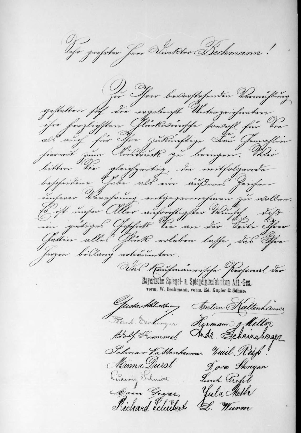 | Beschreibung | Glückwunschschreiben der kaufmännisches Personal der Bayerischen Spiegel- u. Spiegelglasfabriken AG zur Hochzeit Hugo und Ida Bechmann | ||