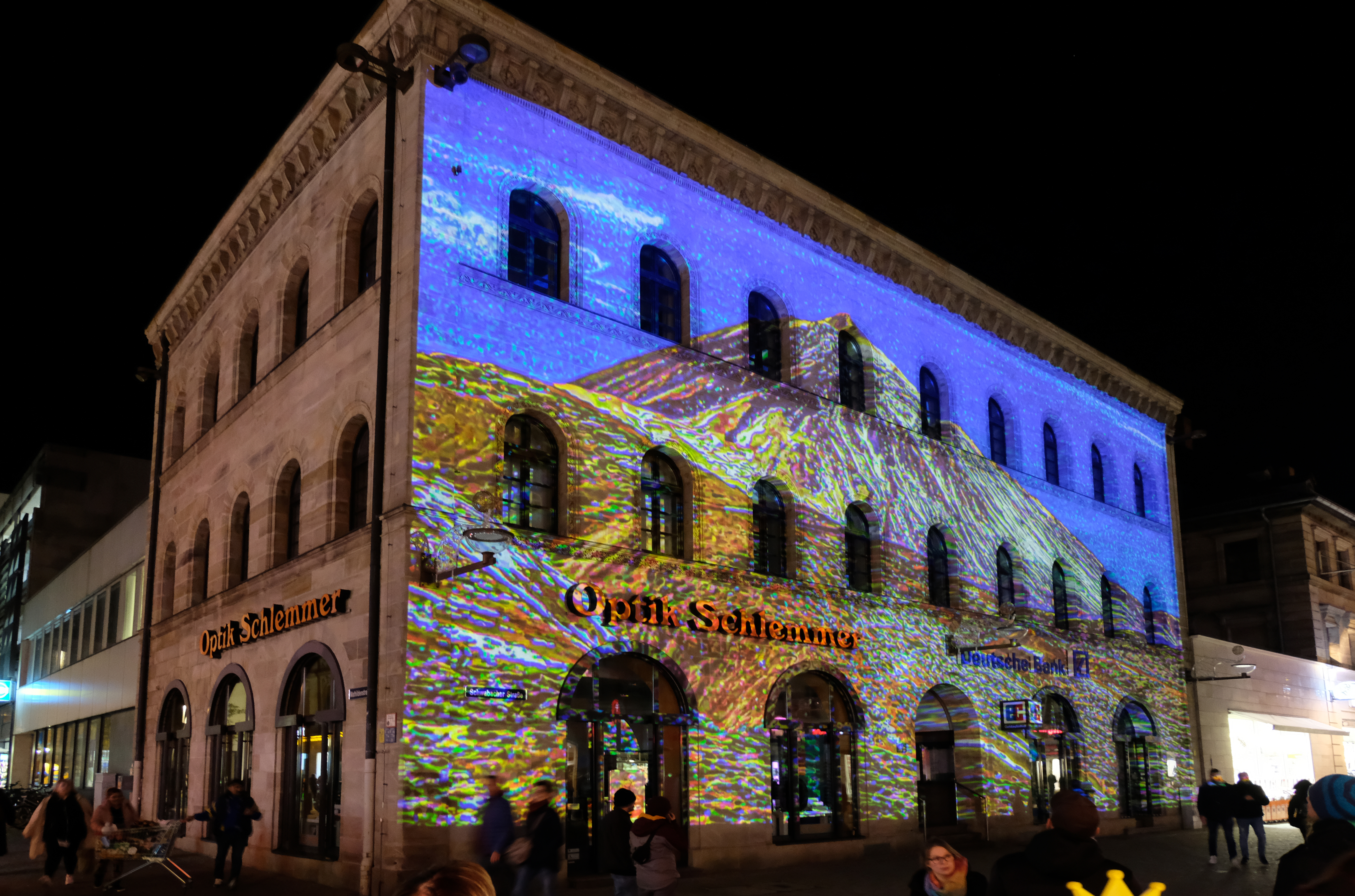 | Beschreibung | Projektion auf das Gebäude der Schwabacher Straße 32 zu den Fürther Glanzlichtern 2019, Nov. 2019 - Installation der Künstlerin Brigitte Brigitte Hadlich | ||