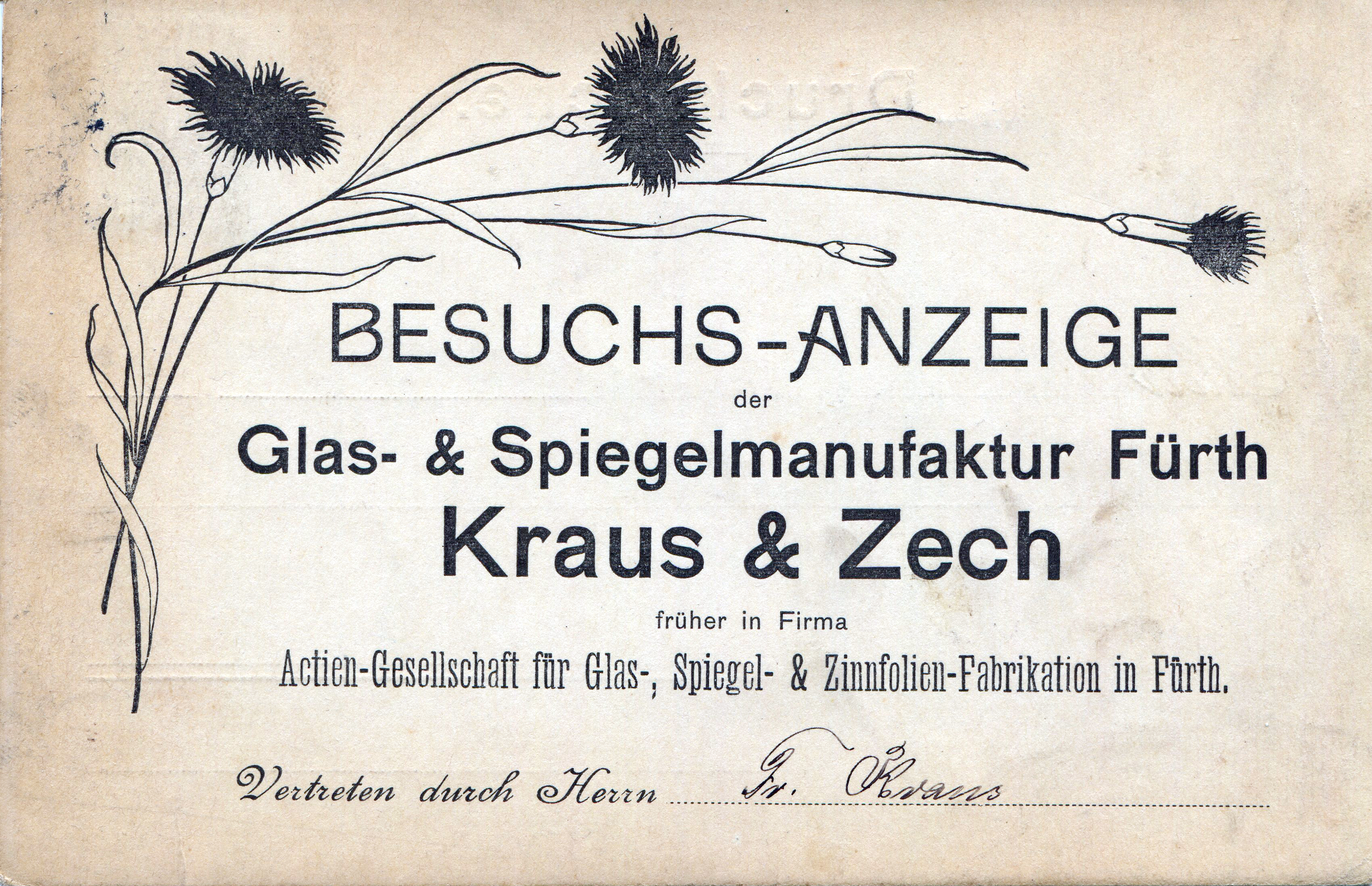 | Beschreibung | Besuchsanzeige der Firma Glas- & Spiegelmanufaktur Fürth Kraus & Zech, gel. 1902 | ||