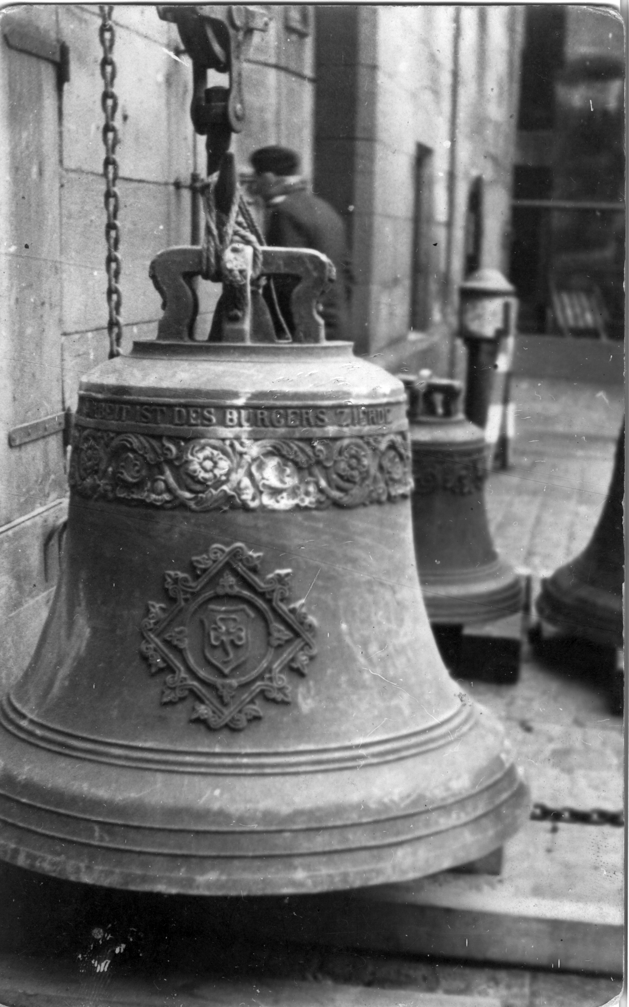 | Beschreibung | Glockenabgabe im Zweiten Weltkrieg am Rathaus Fürth Glockeninschrift: "Arbeit ist des Bürgers Zierde" | ||