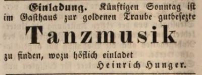 | Beschreibung | Zeitungsannonce von Heinrich Hunger, Wirt zur goldenen Traube, Februar 1844 | ||