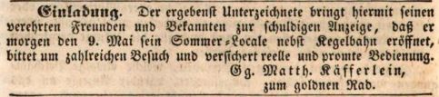 | Beschreibung | Werbeannonce für das Lokal "zum goldnen Rad", 1840 | ||