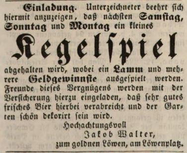 | Beschreibung | Zeitungsannonce von Jakob Walter, Wirt zum goldnen Löwen, Juni 1844 | ||