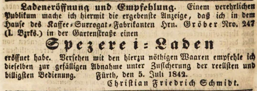 | Beschreibung | Eröffnung des Spezerei-Ladens von C. F. Schmidt, Juli 1842 | ||