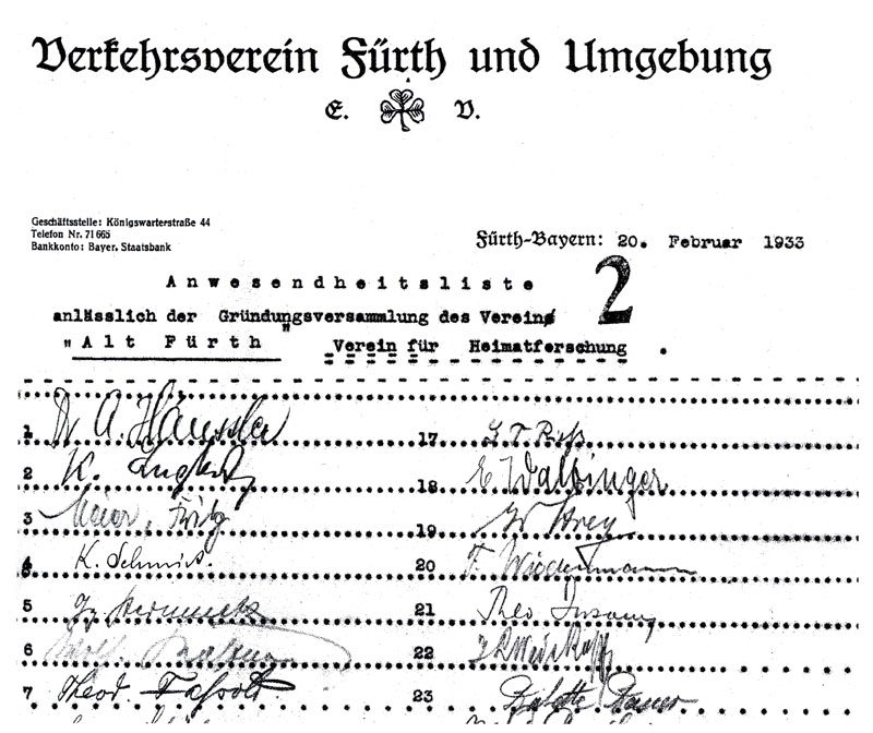 | Quellangaben | Akten des Geschichtsvereins & Fürther Geschichtsblätter 4/08; Barbara Ohm, Ein Verein in Bewegung: Gestern - Heute - Morgen, 2008, S. 111 ff. | ||