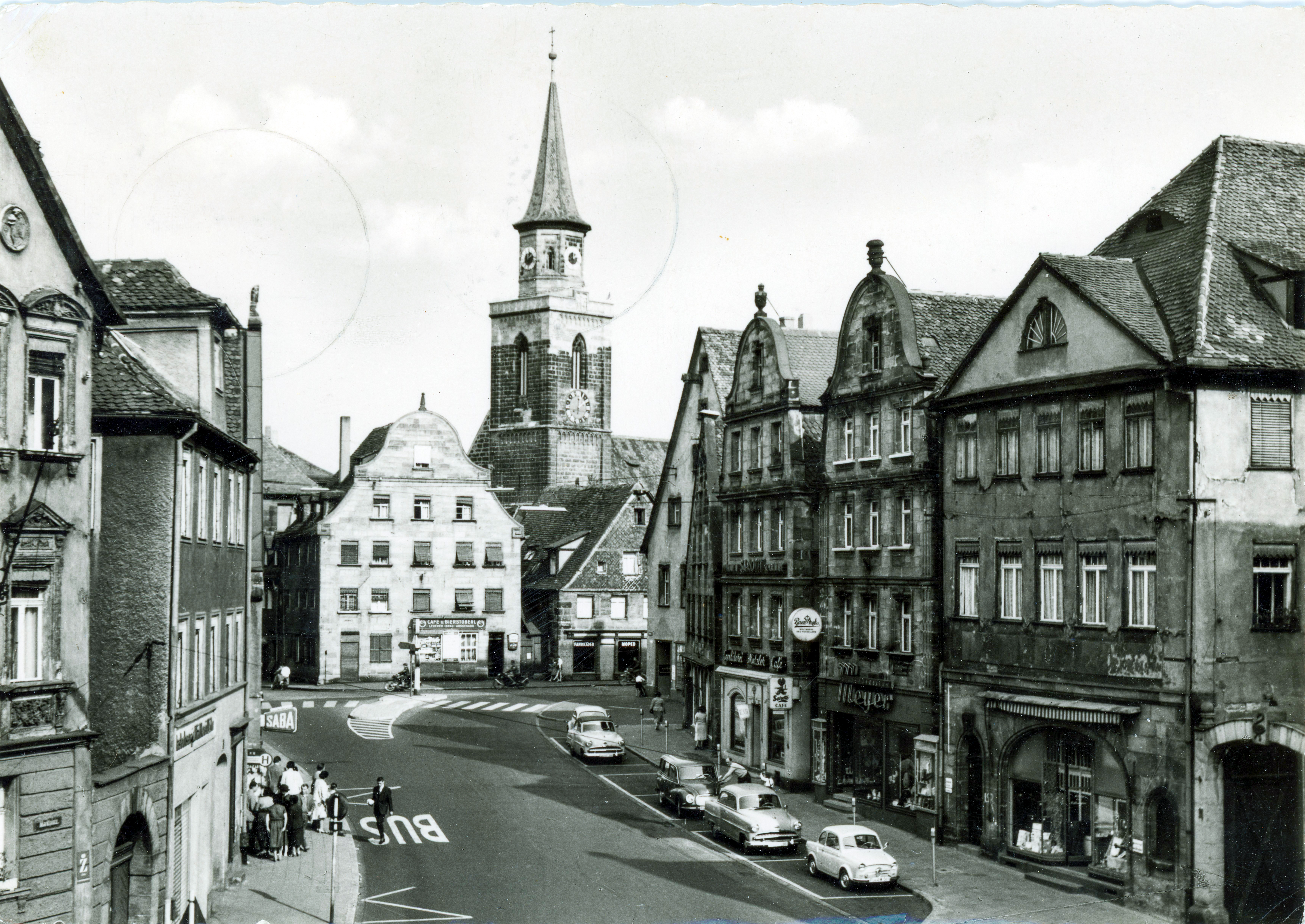 | Beschreibung | Ansichtskarte vom ehem. Marktplatz, gel. 1964 | ||
