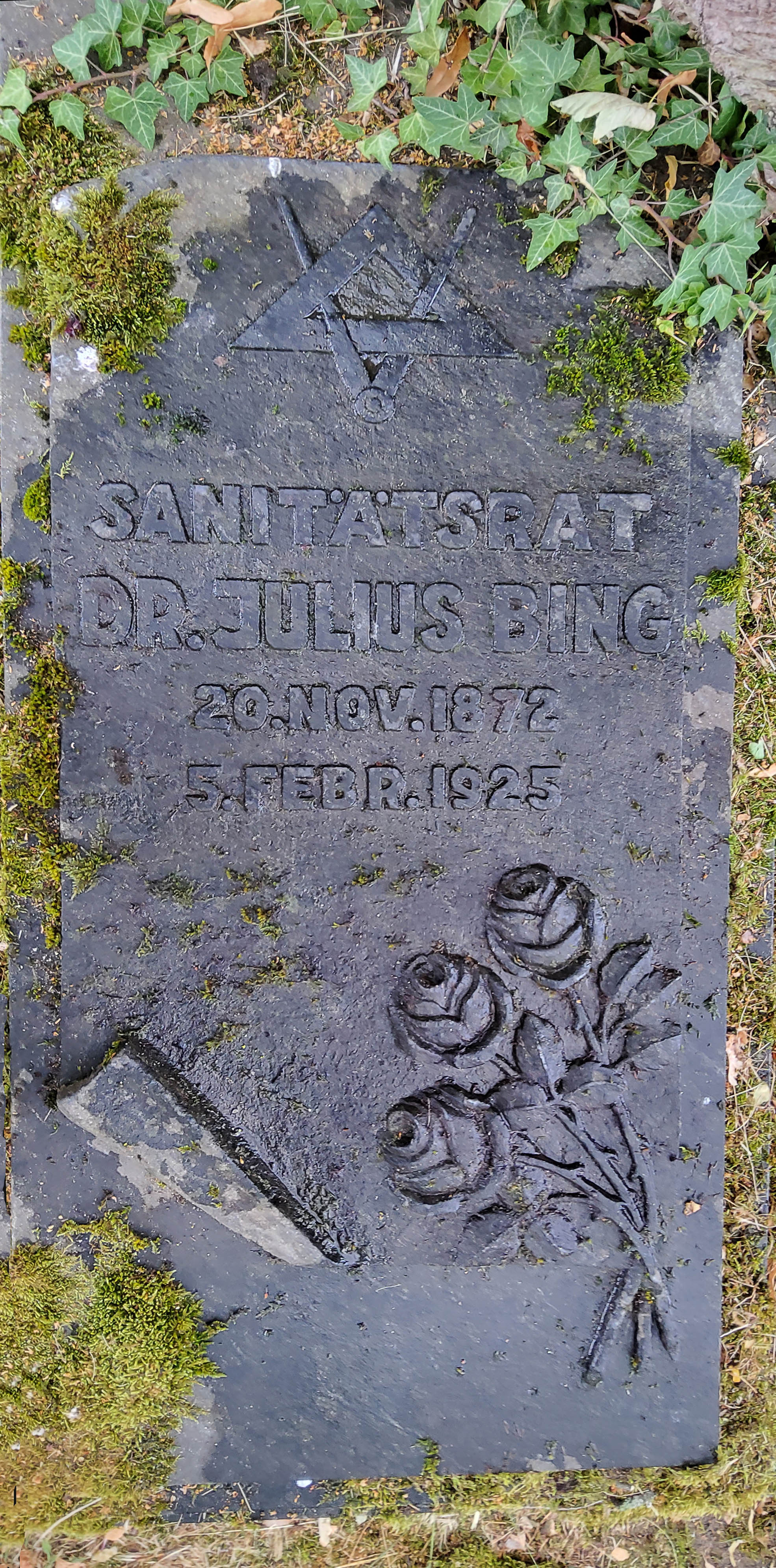 | Beschreibung | Liegender Grabstein von Sanitätsrat Julius Bing mit Freimaurer-Symbolik | ||