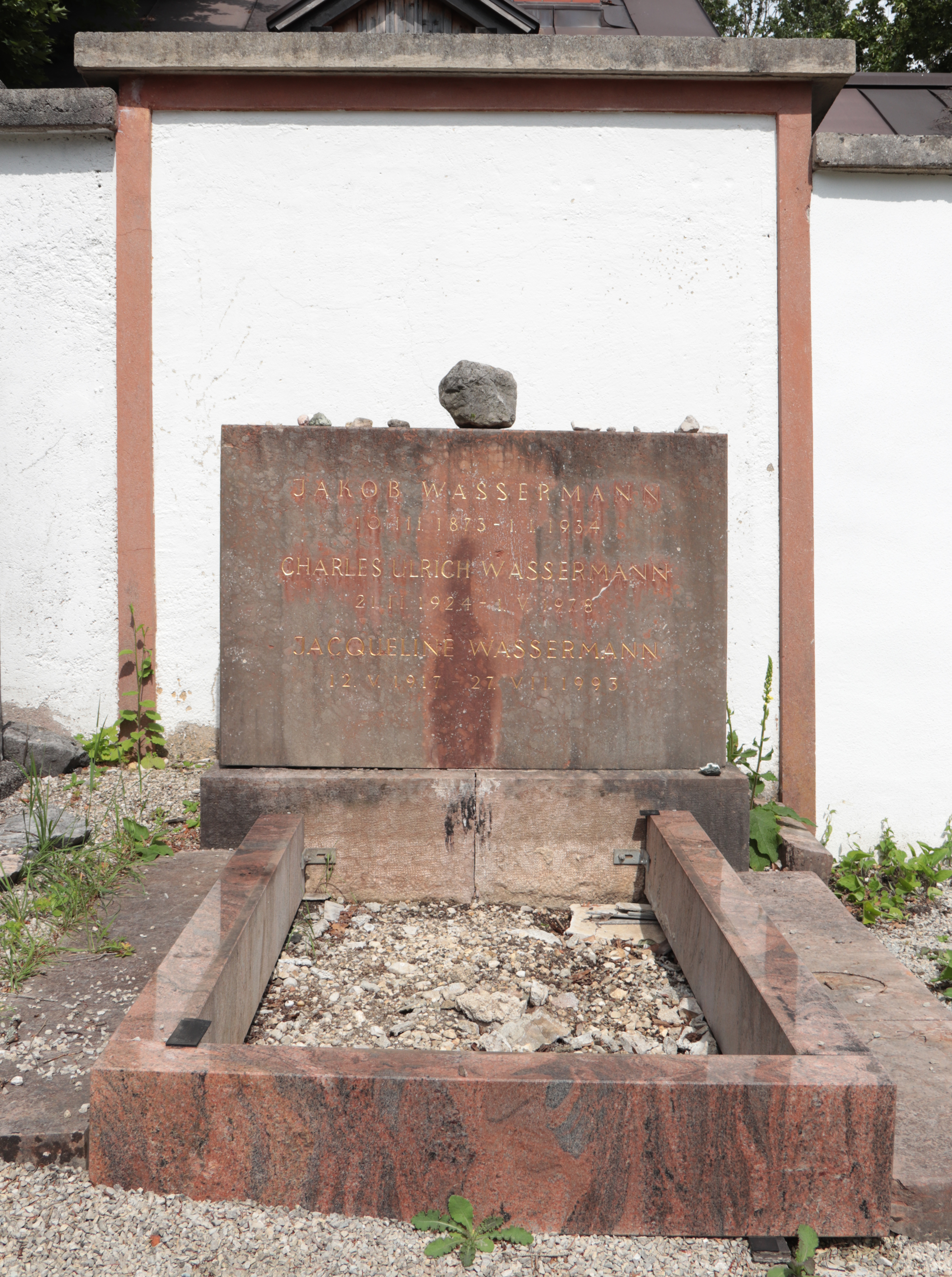BeschreibungGrab Jakob Wassermanns, seines Sohnes Charles und seiner Schwiegertochter Jacqueline auf dem Friedhof Altaussee. Zum Zeitpunkt der Aufnahme fehlte die Grabplatte.