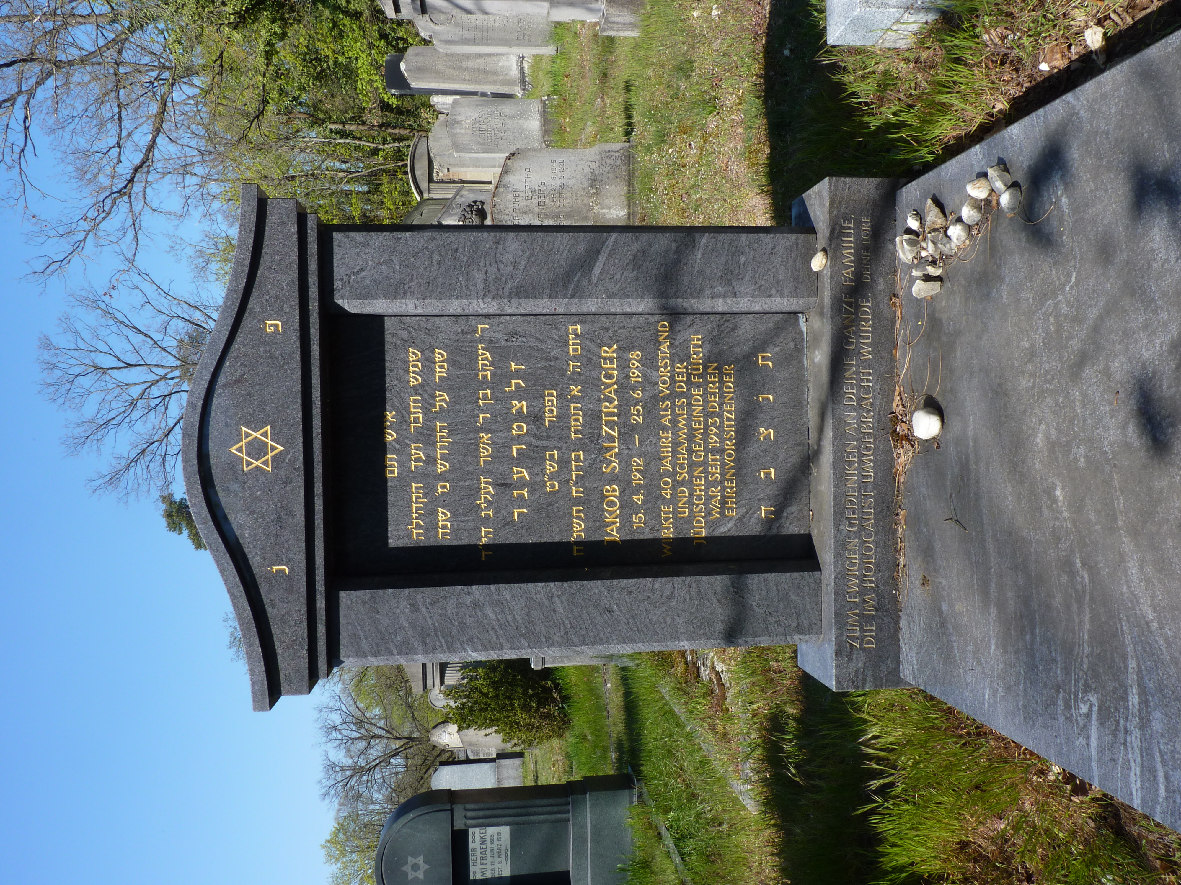| Dateiinfo (Bild-Unterschrift und Info-Box, automatisch erstellt) | Grabstein Jakob Salzträger auf dem neuen jüdischen Friedhof in Fürth, Feld I.10b Urheber: Chrischmi<br><br>Lizenz: CC BY-SA 3.0 | ||