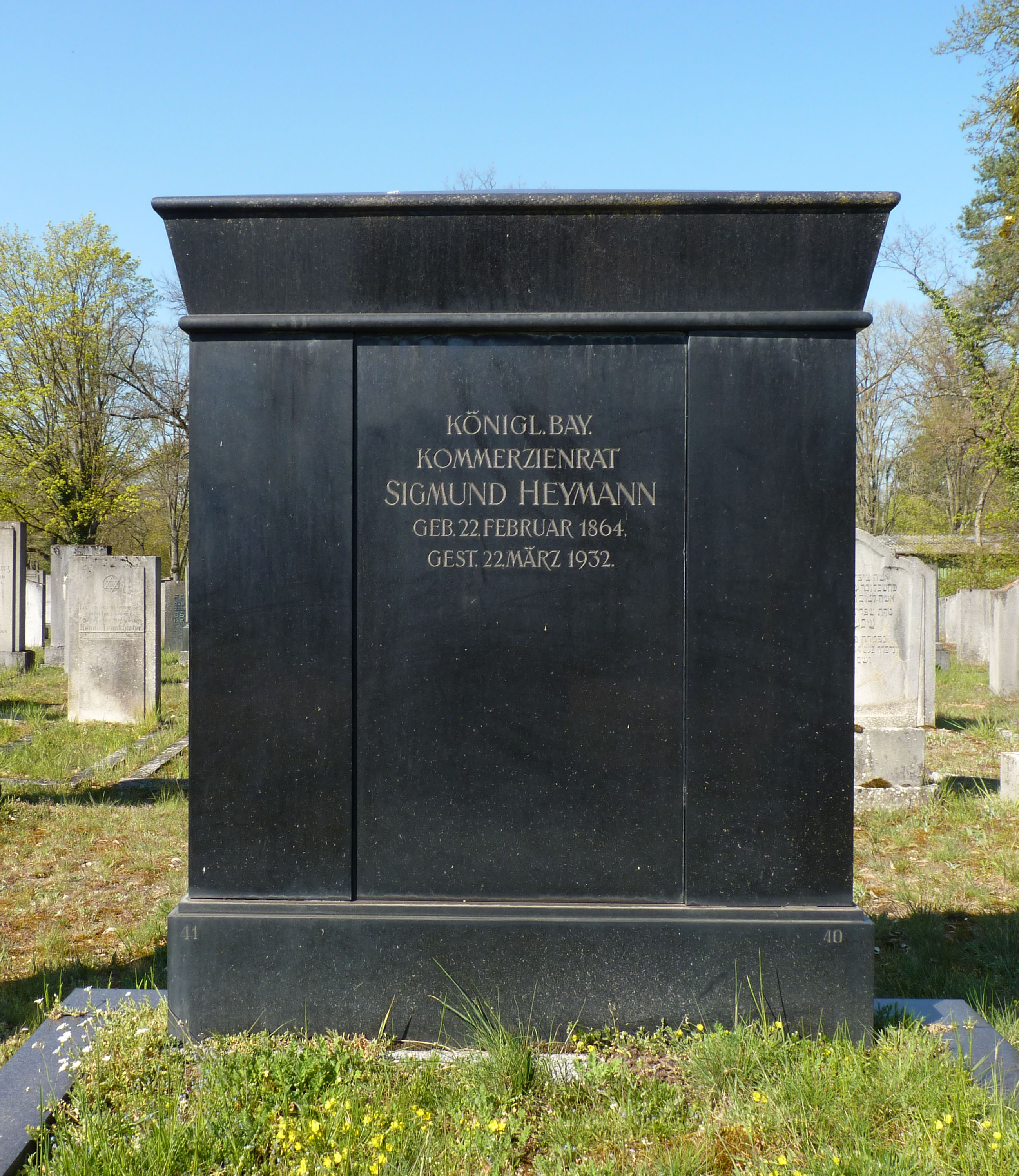 | Beschreibung | Grabstein Sigmund Heymann, neuer jüdischer Friedhof Fürth, Feld VII.40-41 | ||