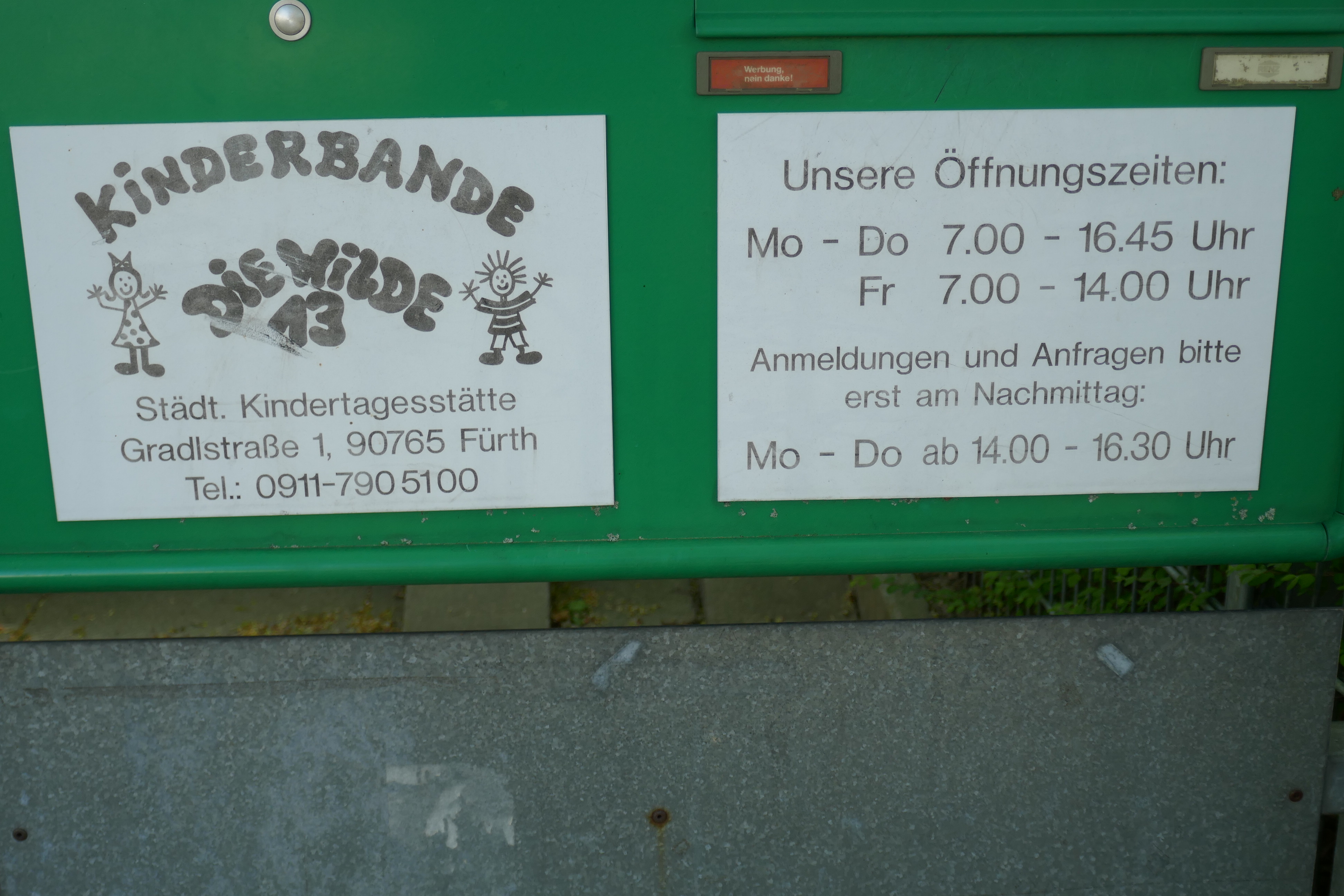 | Dateiinfo (Bild-Unterschrift und Info-Box, automatisch erstellt) | Kindertagesstätte Die Wilde 13 in der Gradlstraße, April 2020 Urheber: Web Trefoil<br><br>Lizenz: CC BY-SA 3.0 | ||