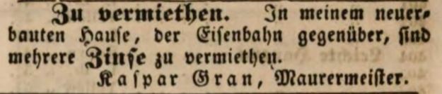 | Beschreibung | Zeitungsanzeige des Maurermeisters Kaspar Gran, April 1847 | ||