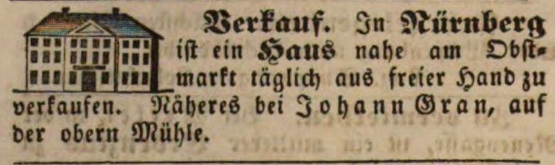 | Beschreibung | Zeitungsanzeige von Johann Gran, Februar 1848 | ||