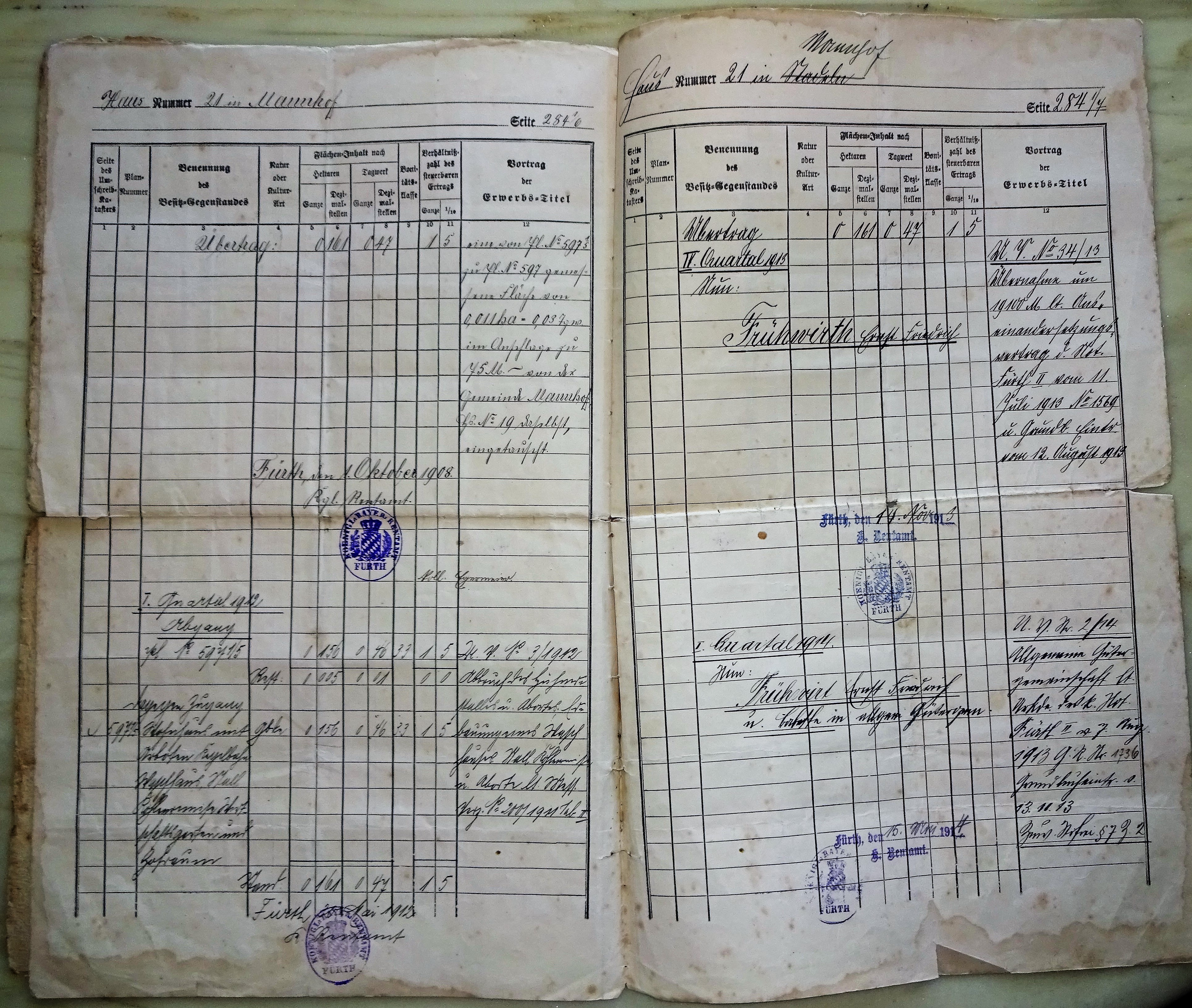 | Beschreibung | Seite 4 + 5 Grundsteuer Kataster Auszug Gemeinde Stadeln und Rentamtsbezirk Fürth 1900 mit Zu- und Abgängen der Grundstücksgröße des Gasthauses Zur Eisenbahn Stadeln am Bahnhof Vach bis 1914 als Grundlage der Grundsteuerberechnung im Königreich Bayern | ||