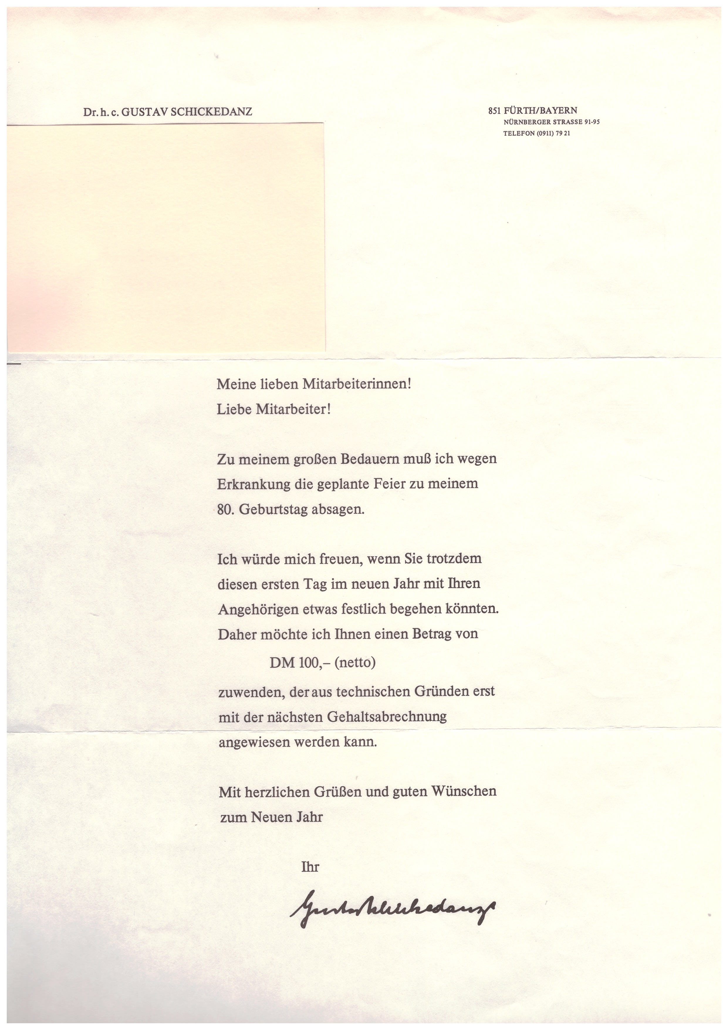 | Dateiinfo (Bild-Unterschrift und Info-Box, automatisch erstellt) | Brief von Gustav Schickedanz an Mitarbeiter*innen anläßl. seines 80. Geburtstages Lizenz: CC BY-SA 3.0 | ||