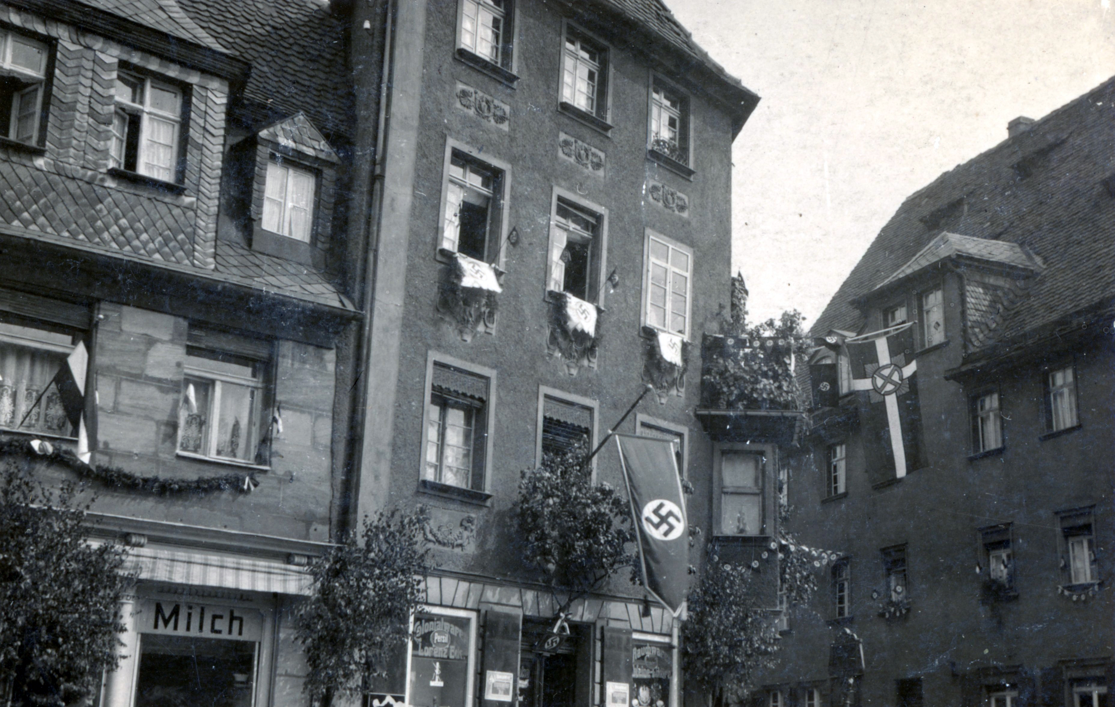 | Beschreibung | Das Gebäude Gustavstraße 54 mit entsprechender NS-Beflaggung, 1942 | ||