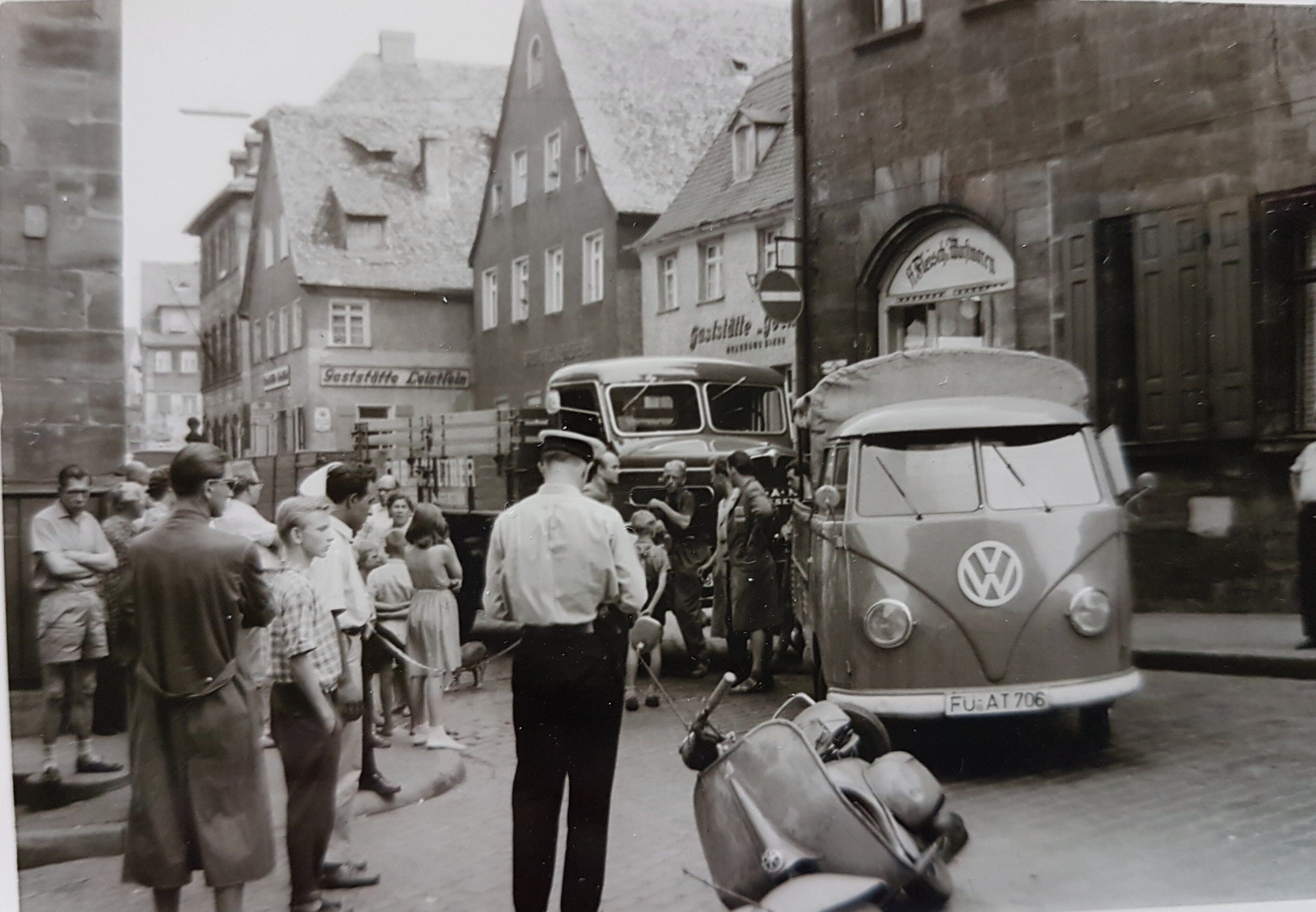 | Beschreibung | Verkehrsunfall in der Gustavstr./Einmündung Mühlstraße, Aufnahme 1950er Jahre – im Hintergrund die Häuser Gustavstr. 9, 7, 3, 1 (von rechts nach links) | ||