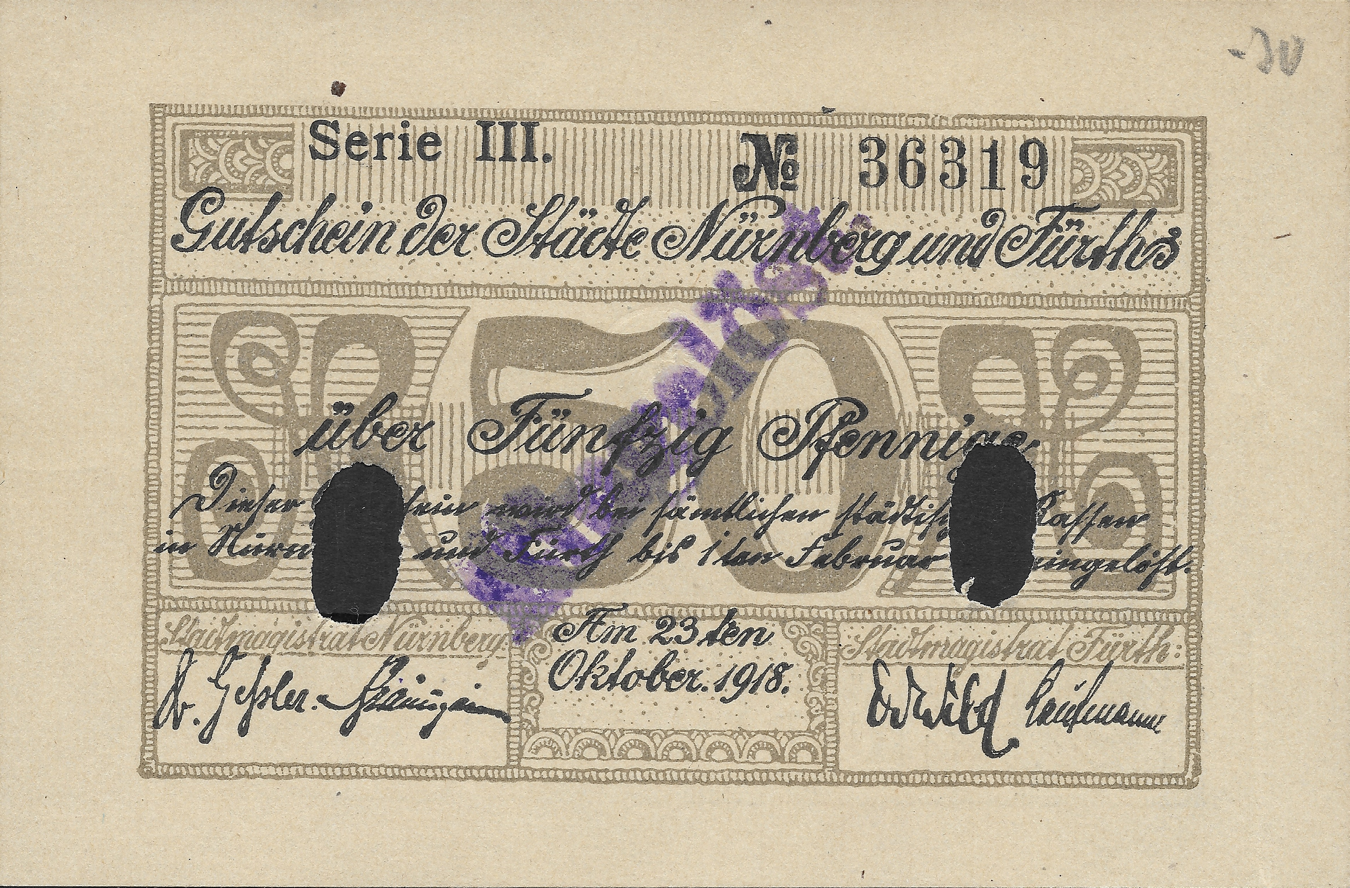 | Beschreibung | Gutschein der Städte Nürnberg und Fürth über 50 Pfennige, Okt. 1918 | ||