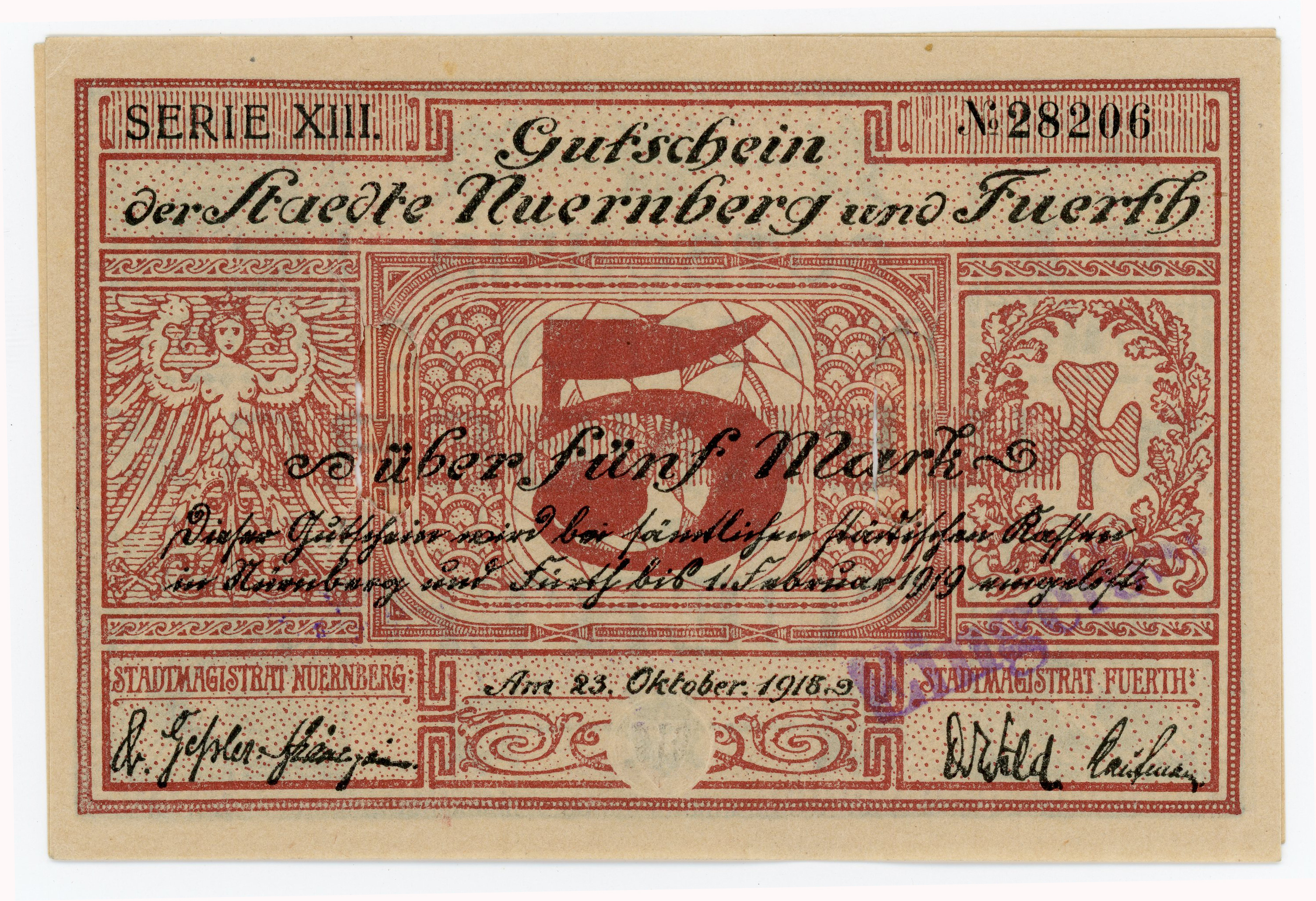 | Beschreibung | Gutschein der Städte Nürnberg und Fürth über 5 DM, Okt. 1918 | ||