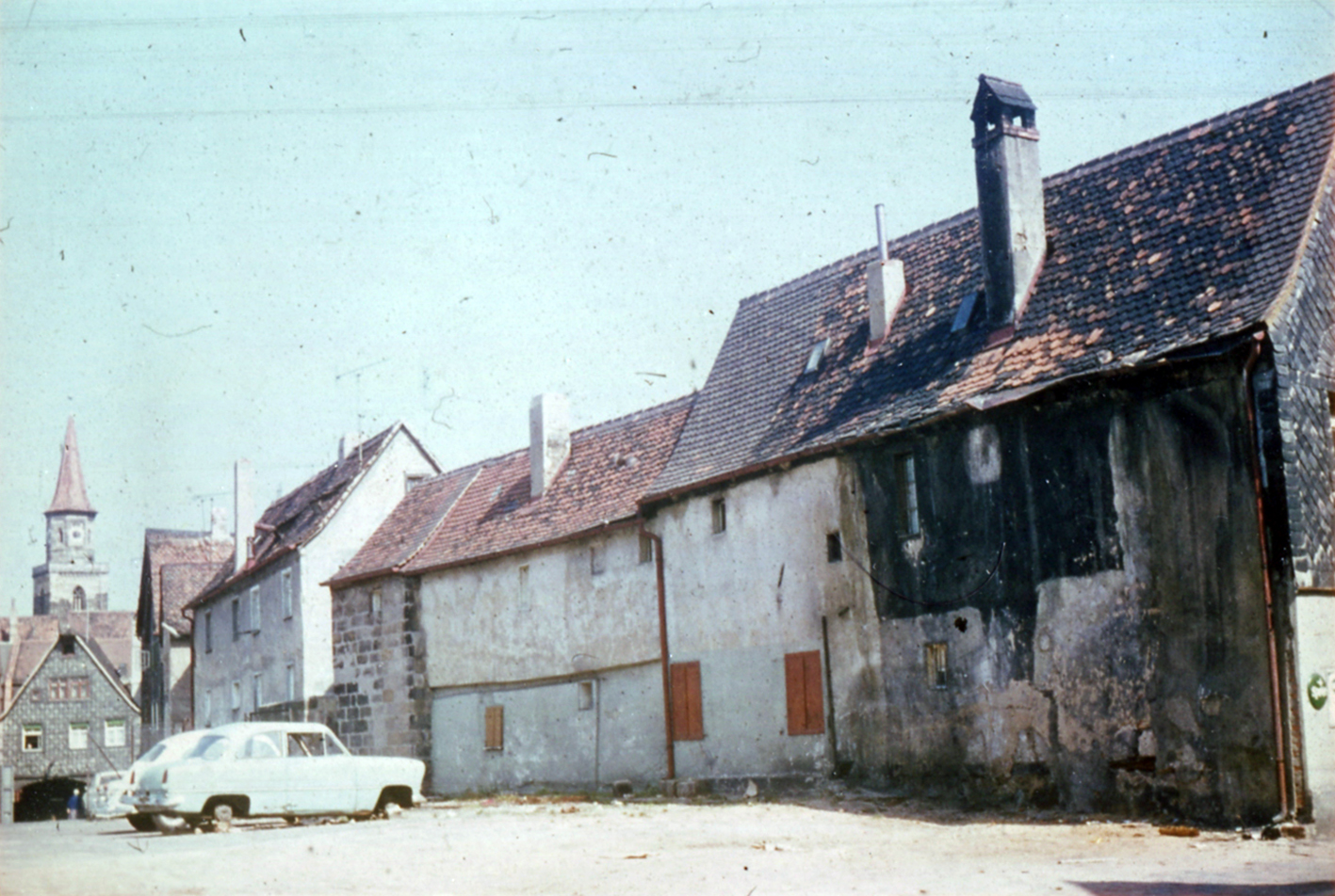 | Beschreibung | Häuserrückseite zum ehem. Schulhof (Synagoge), links im Hintergrund Kirche St. Michael, 1969 (über der Königstraße das schieferverkleidete Anwesen Königstraße 45 mit ehem. 2. Zufahrt zum Gasthof "Zum Goldenen Schwan") | ||