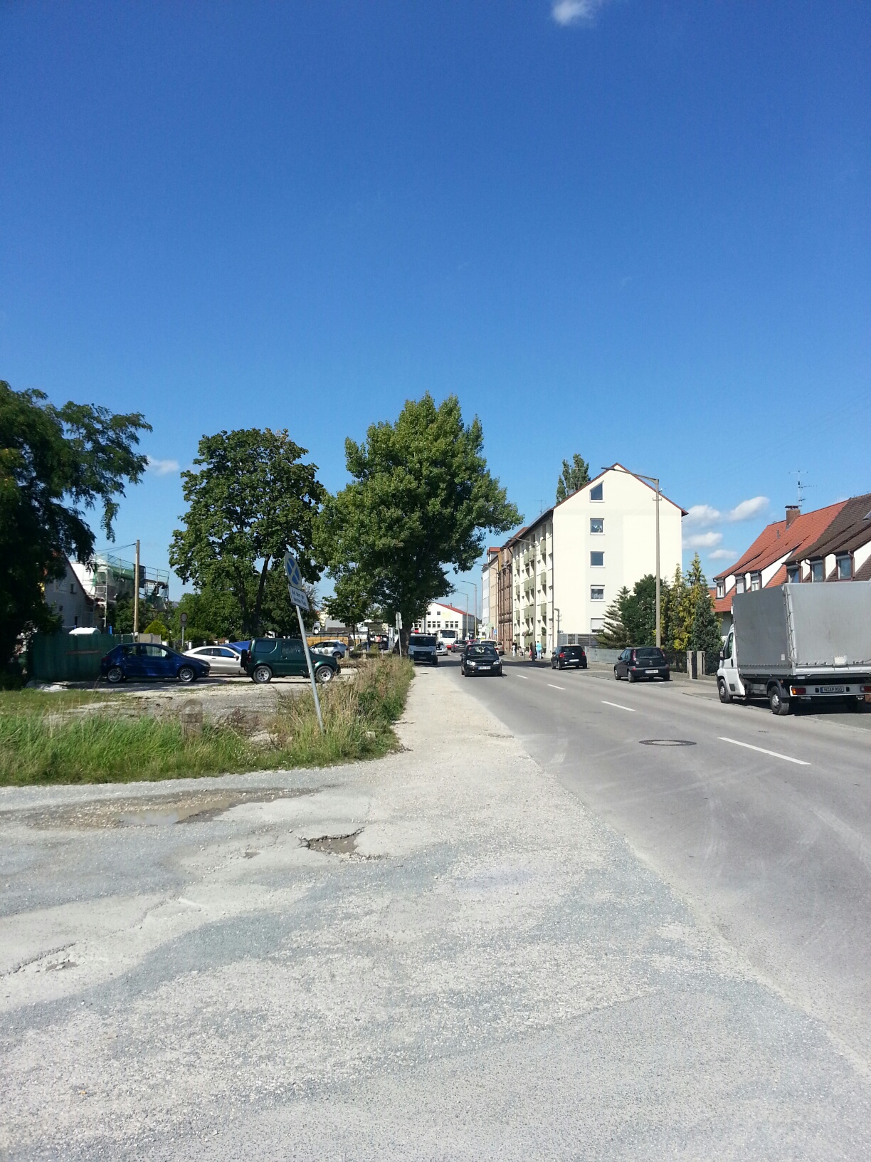 | Beschreibung | Höfener Straße in Richtung Norden vor Erweiterung für die Höfener Spange. Auf Höhe des ersten Wohnblocks rechts querte der Leyher Landgraben die Straße | ||