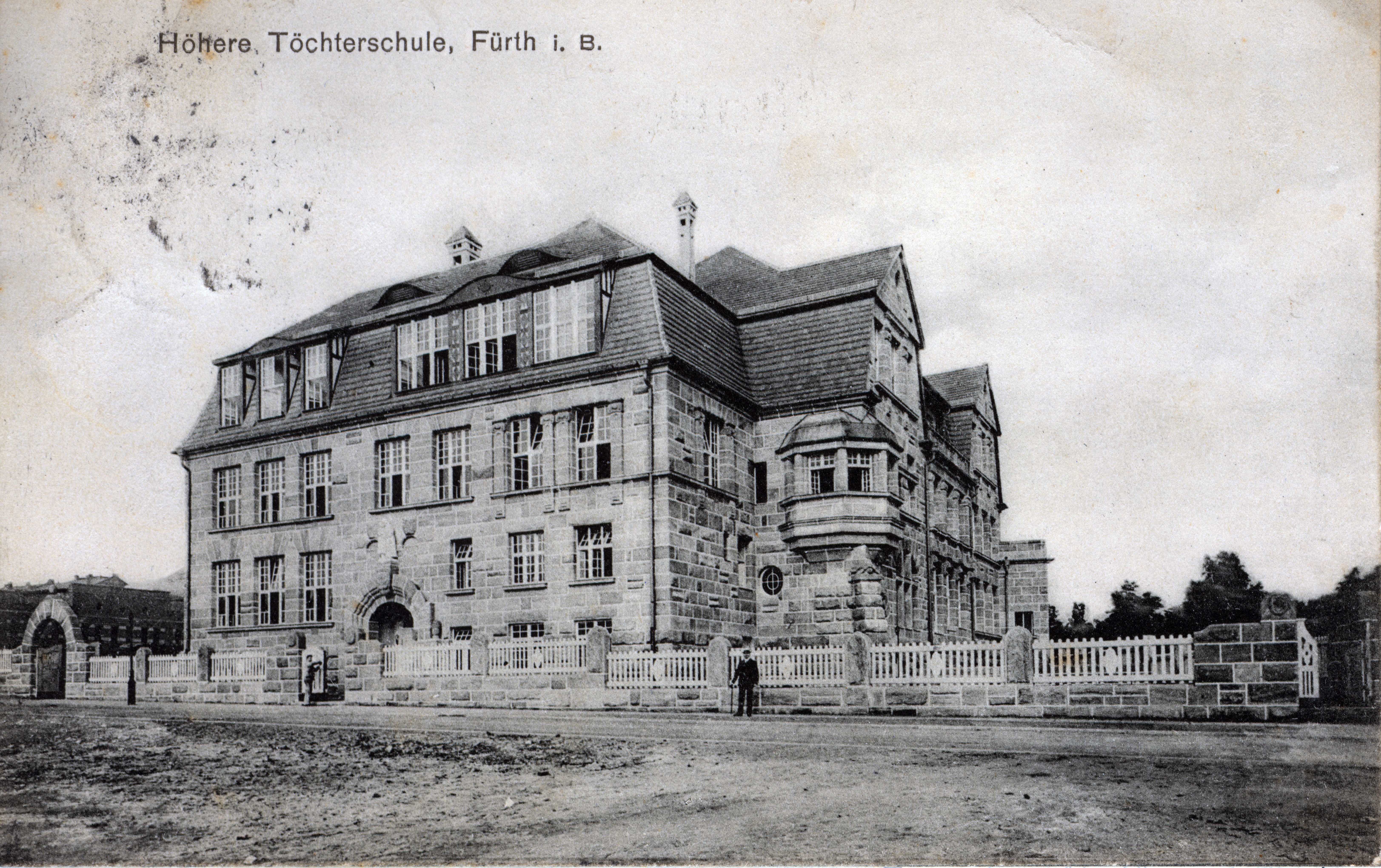 | Dateiinfo (Bild-Unterschrift und Info-Box, automatisch erstellt) | Höhere Töchterschule Fürth, Postkarte gel. 1908 Urheber: Eugen Petersen, Fürth<br><br>Lizenz: CC BY-SA 3.0 | ||