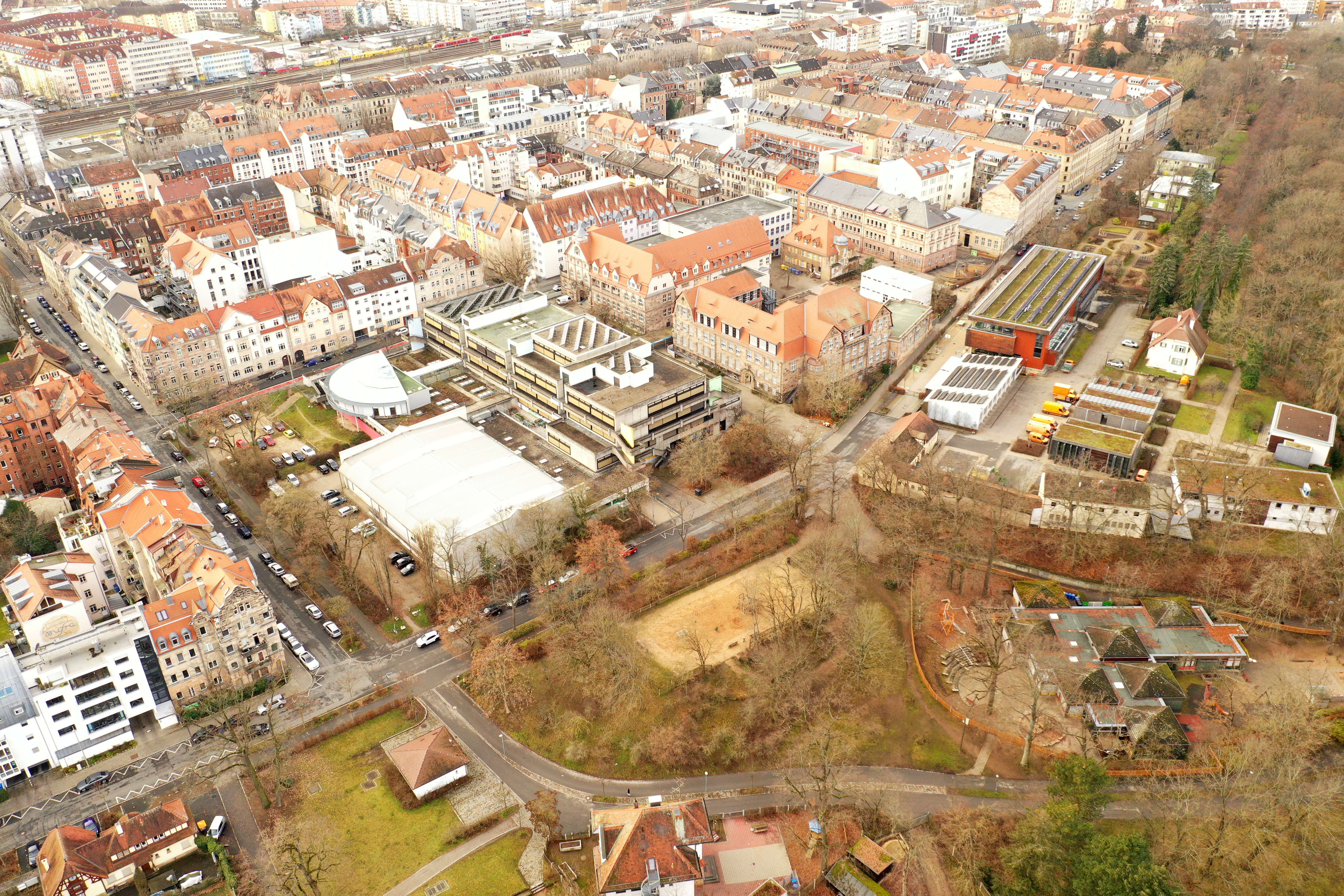 | Beschreibung | Blick vom Wiesengrund über das Schulgelände an der Otto-Seeling-Promenade, Jan. 2020 | ||