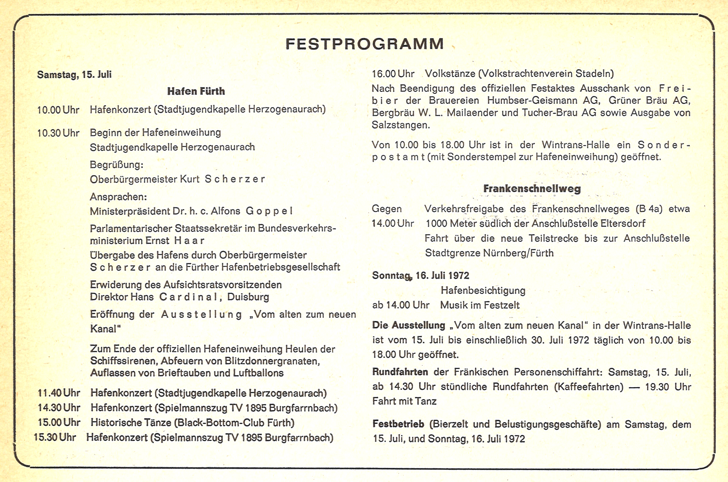 | Beschreibung | Festprogramm zur Eröffnung des Fürther Hafens sowie des Frankenschnellwegs. Sonderausgabe des Amtsblatts der Stadt Fürth, S. 212, Juli 1972 | ||