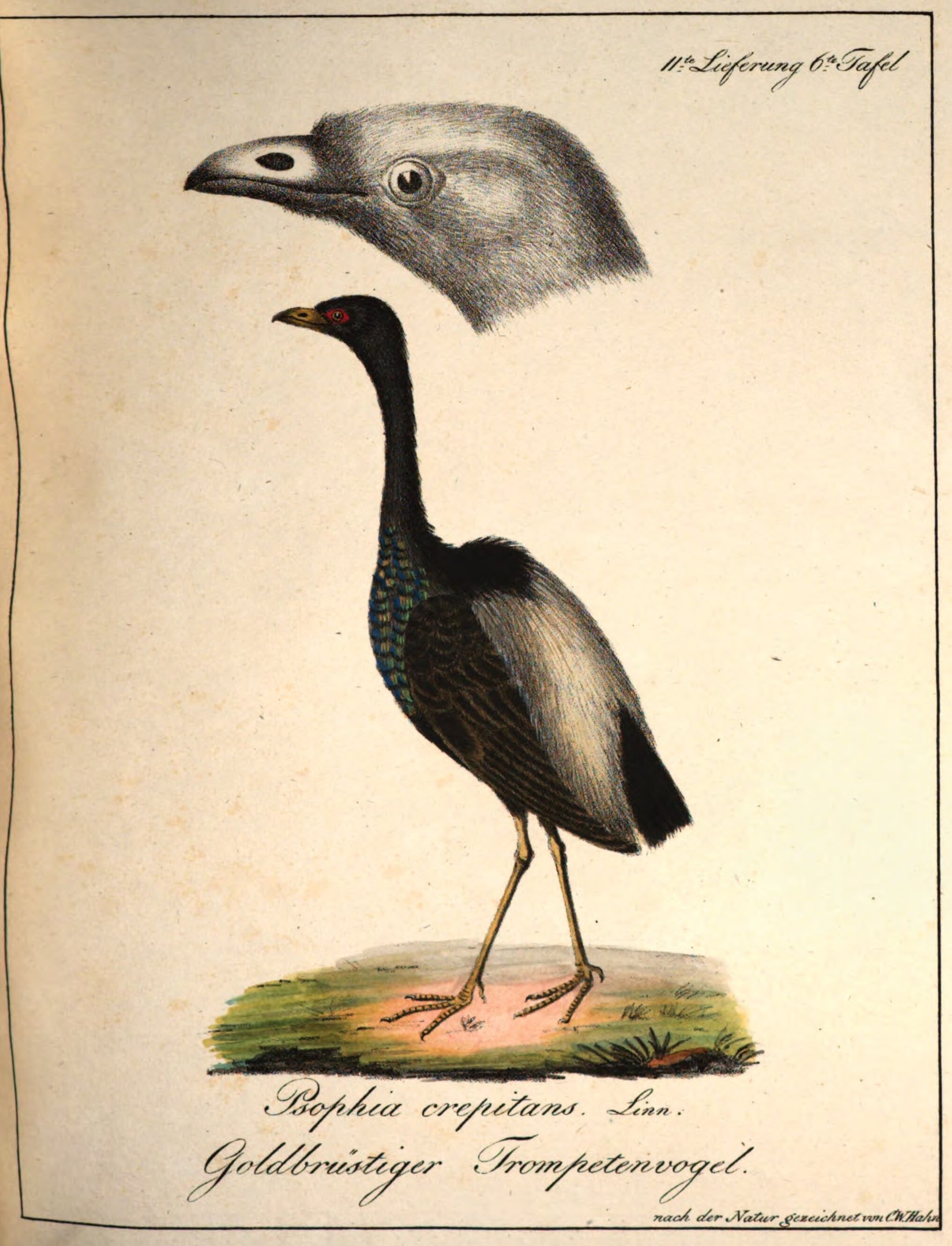| Beschreibung | "Goldbrüstiger Trompetenvogel", Zeichnung von Carl Wilhelm Hahn, 1818 | ||