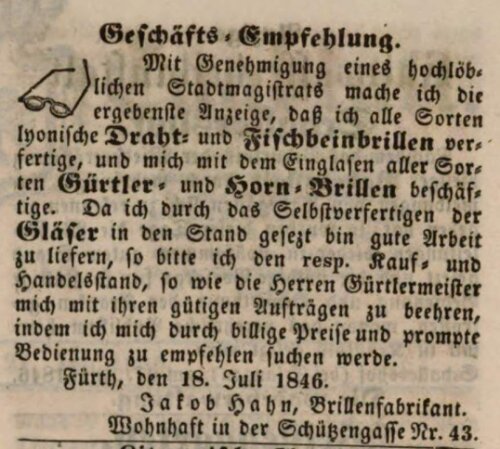 | Beschreibung | Brillenfabrikant Hahn in der Schützengasse, Juli 1846 | ||