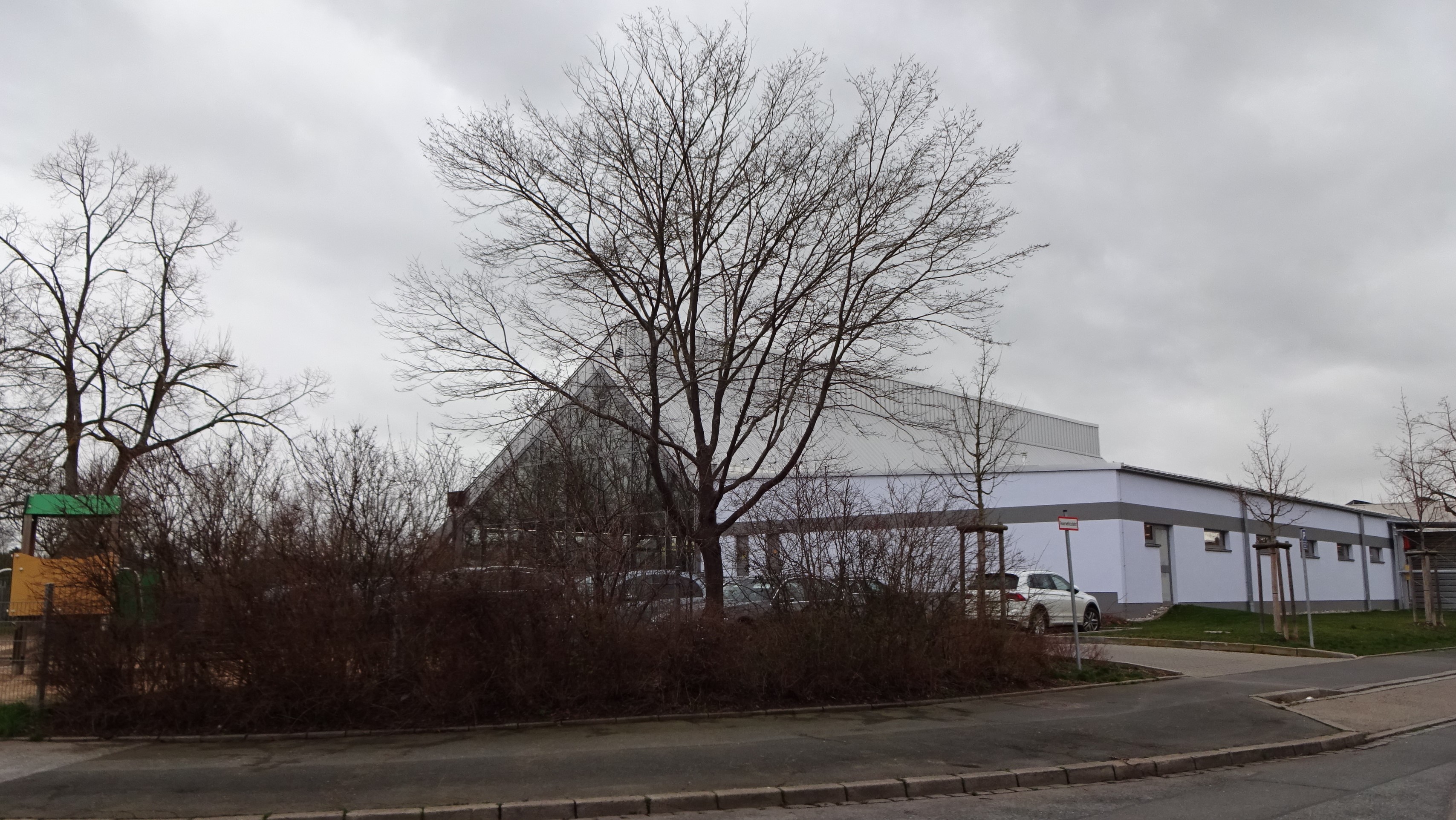 Hallenbad Stadeln von Nord-Osten mit Parkplatz im März 2020