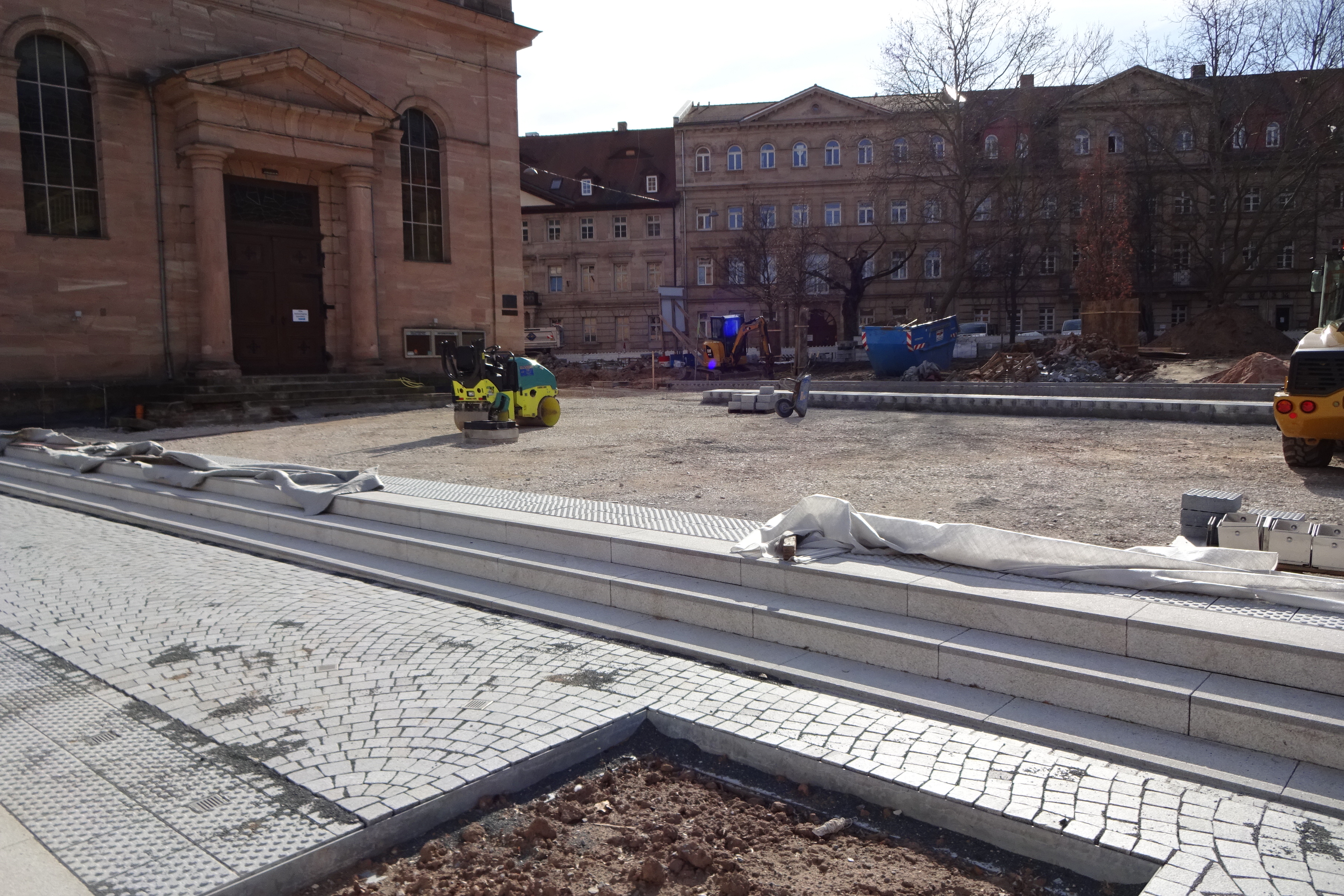 Kirche „Zu Unserer Lieben Frau“ mit weiträumigen Umbaumaßnahmen am Hallplatz im März 2020. Im Hintergrund die Alexanderstraße. Im Hintergrund die Anwesen Alexanderstraße28+30+32.