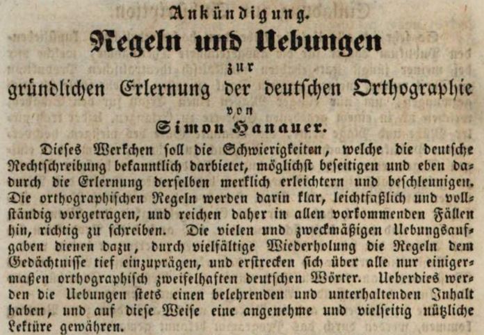 | Dateiinfo (Bild-Unterschrift und Info-Box, automatisch erstellt) | Zeitungsanzeige des Lehrers Simon Hanauer, April 1843 Lizenz: NoC-NC 1.0 | ||