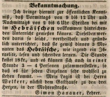 | Dateiinfo (Bild-Unterschrift und Info-Box, automatisch erstellt) | Zeitungsanzeige des Lehrers Simon Hanauer, August 1844 Lizenz: NoC-NC 1.0 | ||