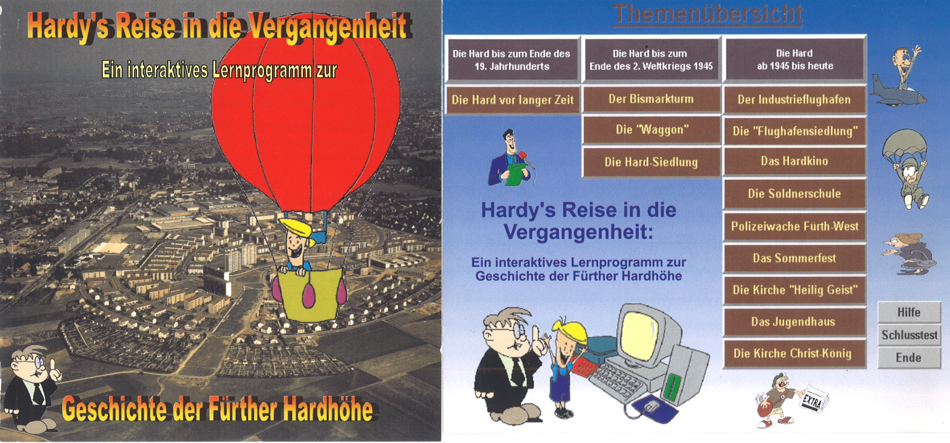 | Dateiinfo (Bild-Unterschrift und Info-Box, automatisch erstellt) | Geschichte der Fürther Hardhöhe, Interaktive CD, Geschichtsprojekt der Soldnerschule aus dem Jahr ... Geschichte der Fürther Hardhöhe, Interaktive CD, Geschichtsprojekt der Soldnerschule aus dem Jahr 2000<br>Urheber: Grund- und Mittelschule Soldnerstraße<br><br>Lizenz: copyright | ||