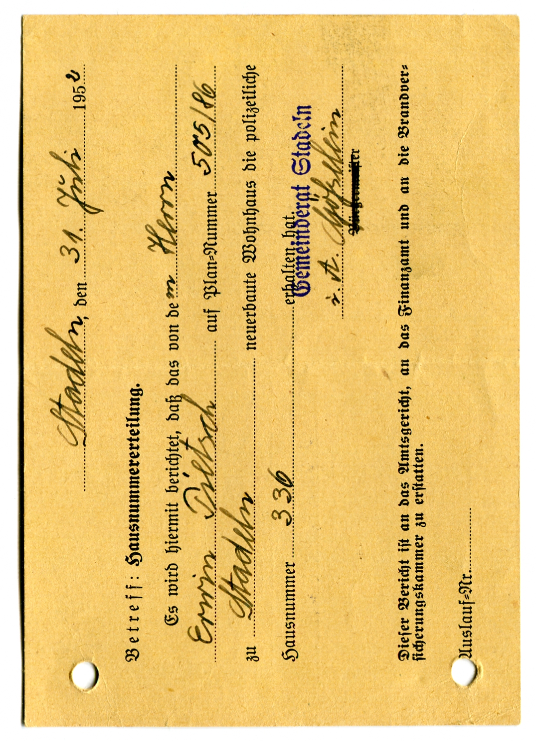 Hausnummern Vergabe 1952 der Gemeinde Stadeln für Neubauten. Die Nummern wurde je nach Fertigstellung quer über den ganzen Ort vergeben. Armer Postbote. Die neue geordnete und straßenmäßige Durchnummerierung erfolgte erst 1963.