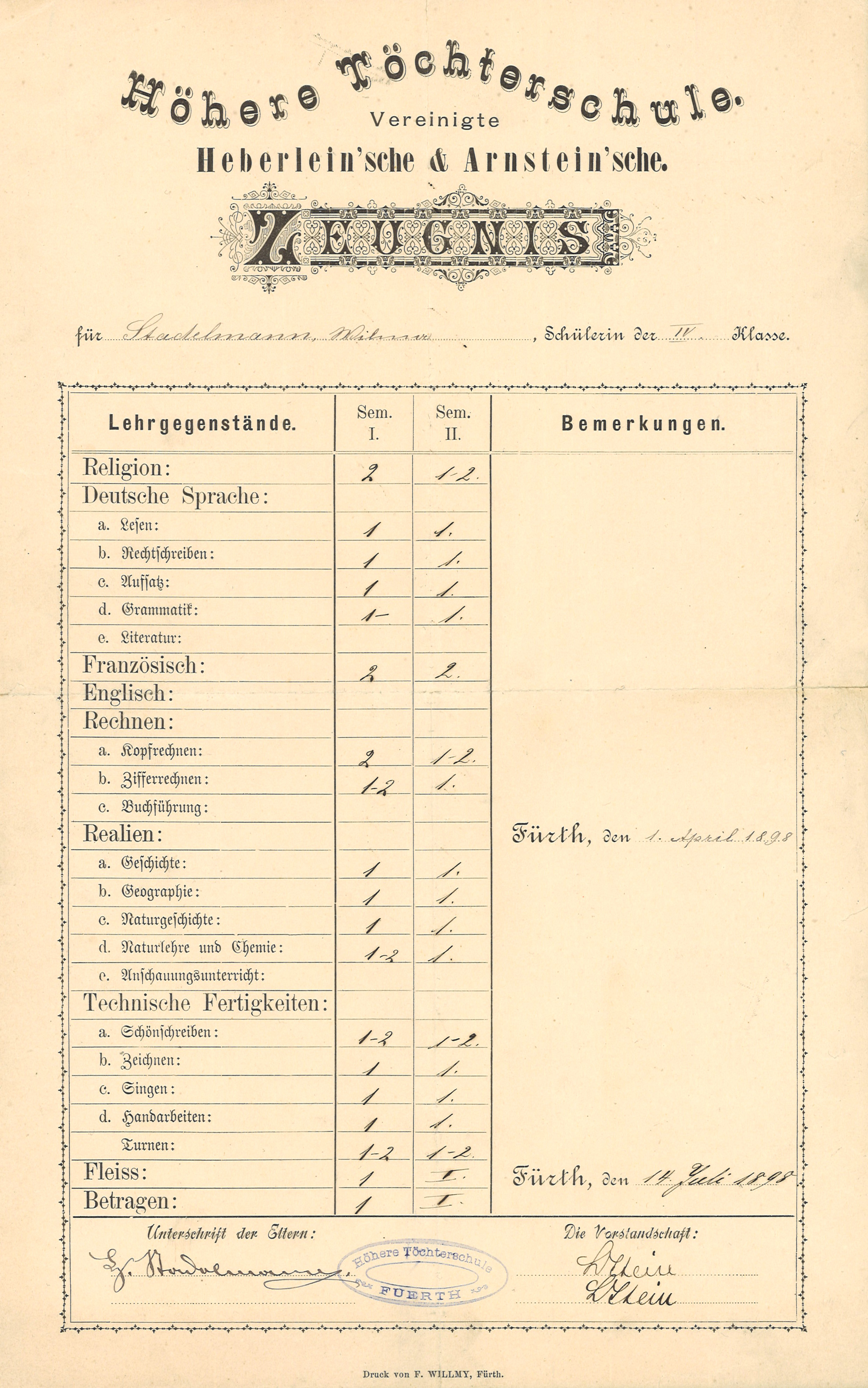 | Beschreibung | Jahreszeugnis des Vereinigten Heberlein’schen und Arnstein’schen Institutes von 1898 mit Unterschrift des Schulleiters (LStein für Lippmann Stein) | ||