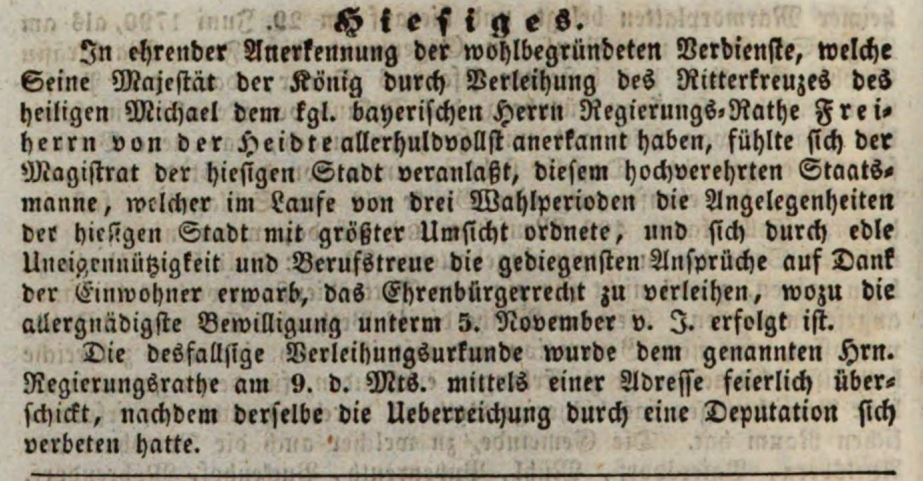 | Dateiinfo (Bild-Unterschrift und Info-Box, automatisch erstellt) | Zeitungsartikel über die Verleihung der Ehrenbürgerwürde an Freiherr von der Heidte, Januar 1843 Lizenz: NoC-NC 1.0 | ||