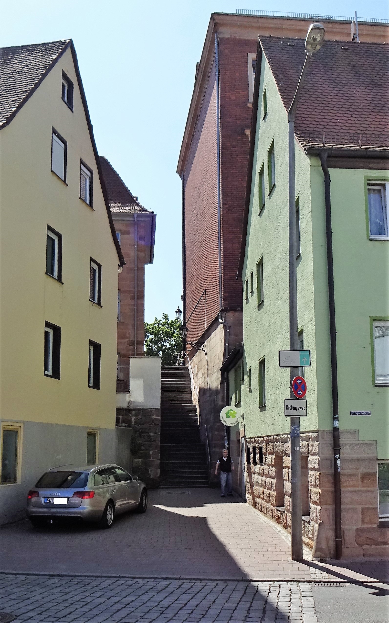 | Beschreibung | Treppen zum Kirchenplatz zwischen den Gebäuden lv. Untere Fischerstraße 19 und vr. Heiligenstraße 12. Dahinter hl. Kirchenplatz 6 und hr. Grundschule Kirchenplatz im Mai 2020 | ||